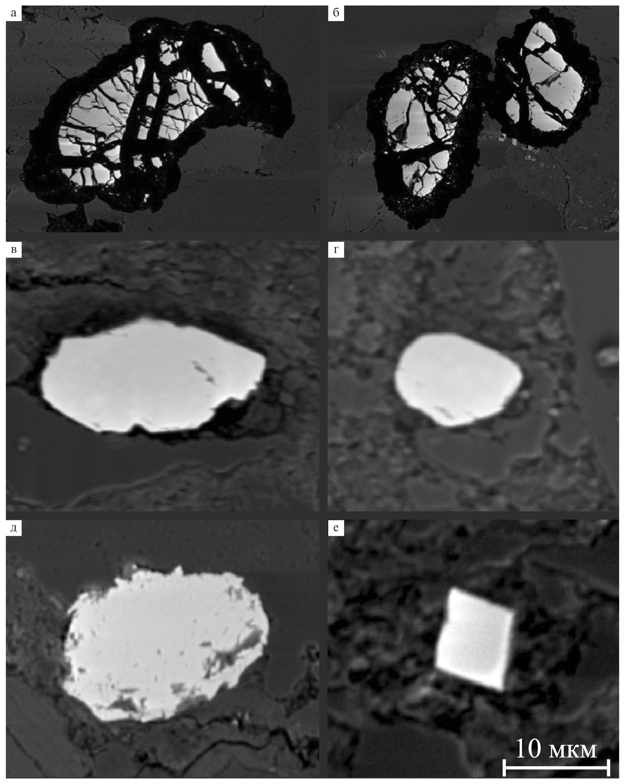 а, б — скв. СПо 3/2778.4 м; в, г — скв. ВОл 311/2776.68 м; д, е — скв. ЗУн 308/2762.43 м. Фото в обратных электронах, микроанализатор CAMECA SX 100.