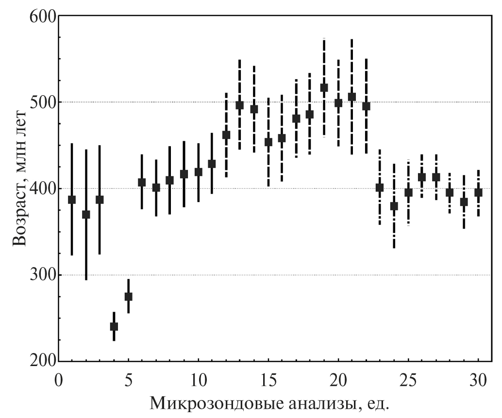 Полученные нами для обломков монацита значения возраста отчетливо подразделяются на две группы: значения 241–276 млн лет характерны для высокоториевого монацита, а 401–429 млн лет — для низкоториевого монацита. Для результатов характерна нормальная погрешность рассчитанного возраста, т. к. измеренные содержания свинца в образцах этой группы относительно высокие — до 0.11–0.13 мас. %.