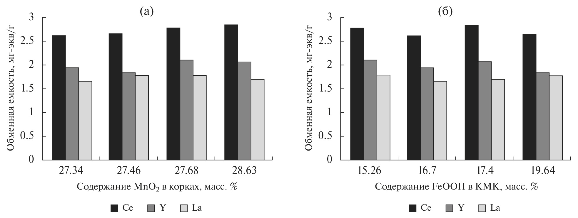Ранее [Новиков, 2011, 2018] было установлено, что марганцевые минералы океанских железомарганцевых образований в результате ионообменных реакций под действием сорбированных катионов Ni 2+ и Со 2+ испытывают трансформации. Для учета подобных трансформаций в случае ионообменных реакций с участием катионов Y 3+, La 3+ и Се 3+, после завершения сорбционных процессов проводился контроль минерального состава продуктов реакций. Результаты исследования показали, что в данном случае минеральный состав рудных минералов КМК и ККО не изменился, это свидетельствует о структурной стабильности Fe-вернадита, Mn-фероксигита, вернадита и гетита в растворах солей вышеперечисленных редкоземельных металлов.