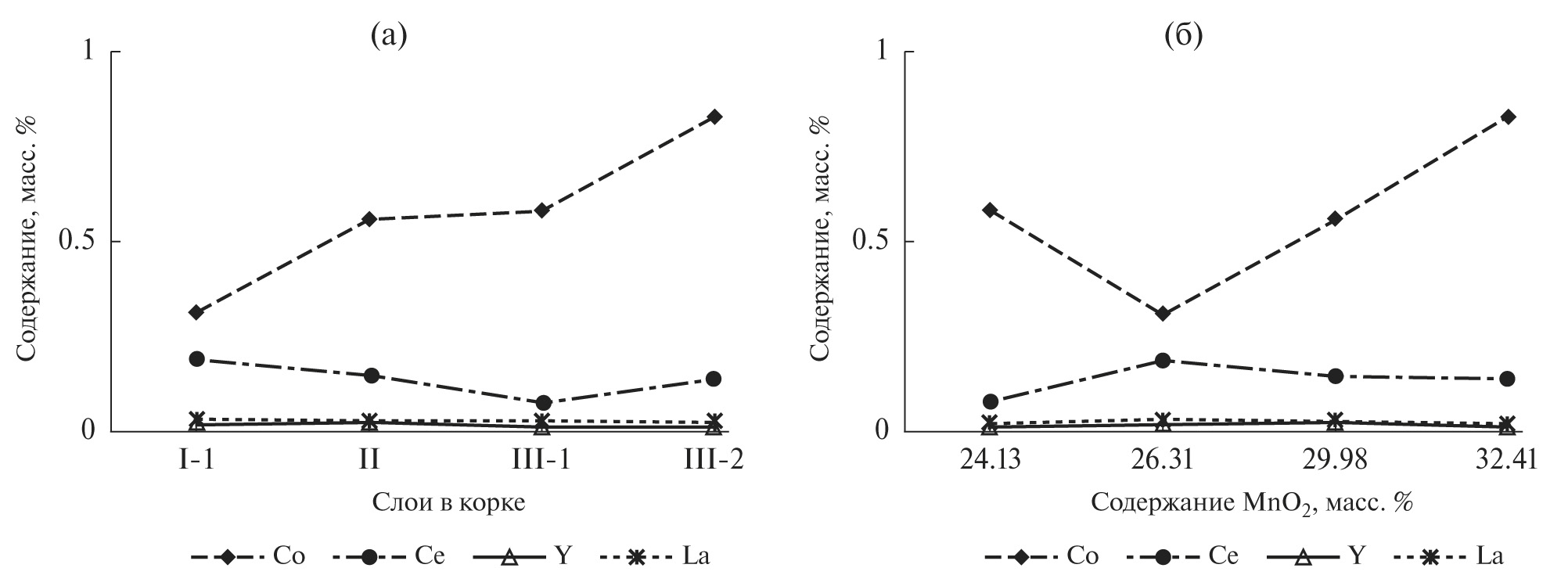 Распределение в тех же слоях содержаний катионов Со 2+ и Се 3+, отнесенных к содержанию MnO2, показывает иной характер, тогда как распределение содержаний катионов Y 3+ и La 3+ в этом случае не меняется (см. рис. 2б).