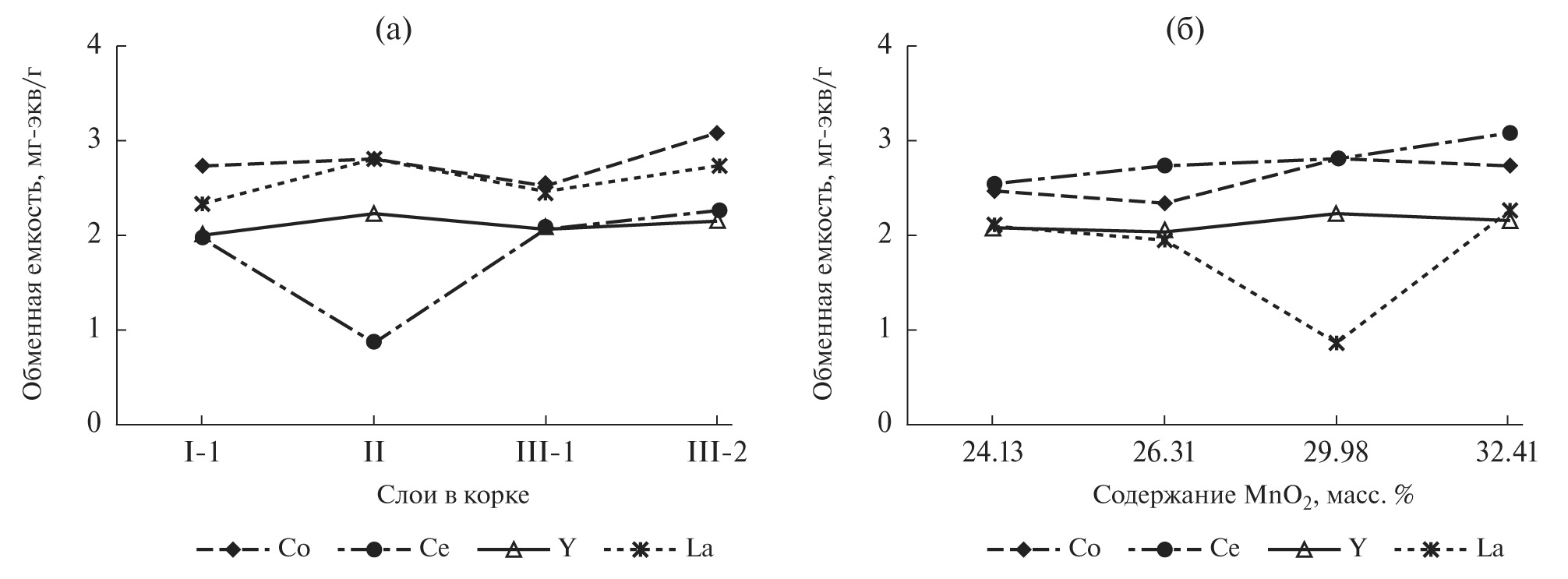 4. Fig. 3. Exchange capacity of ore minerals for Ce3 +, La3 +, Y3 +, Co2 + in different layers of the ferromanganese crust (a) and its dependence on the content of MnO2 (b).