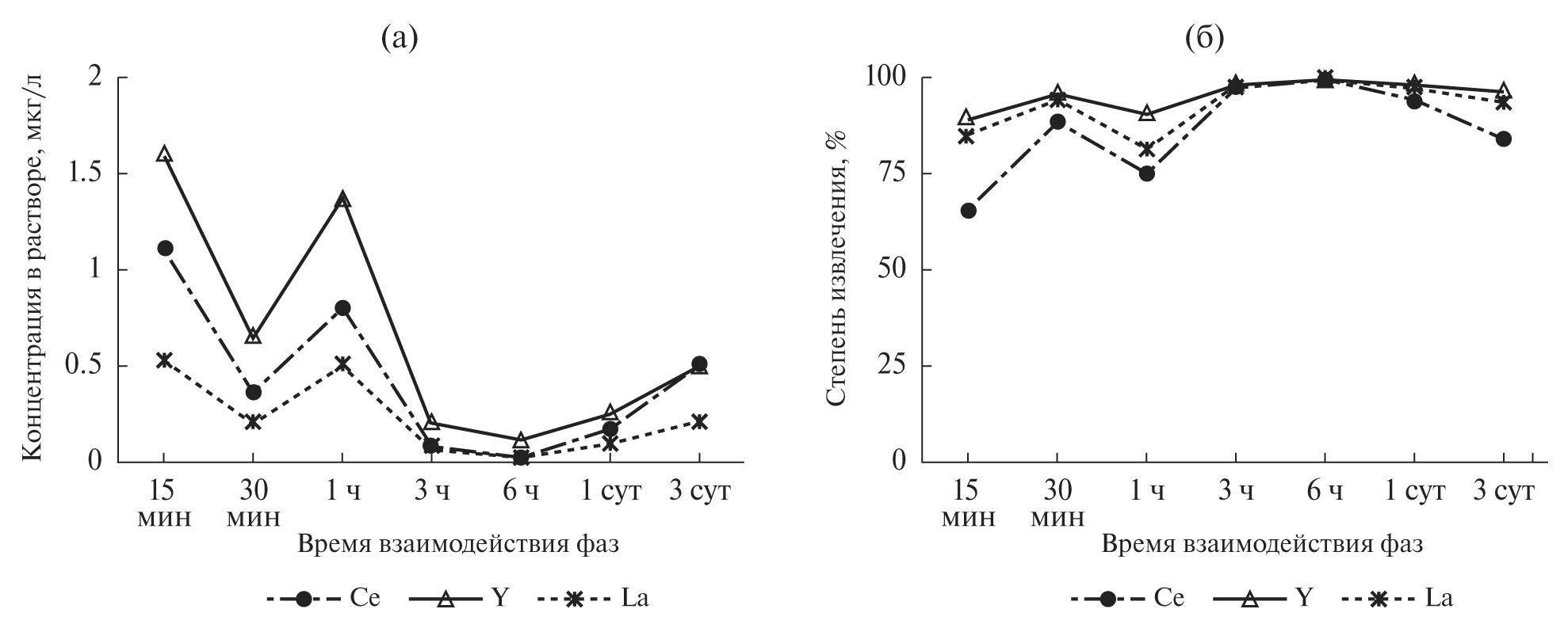 5. Fig. 4. Dependence of the concentration of Ce3 +, La3 +, Y3 + cations in solution (a) and the degree of their extraction (b) on the time of interaction of the phases.