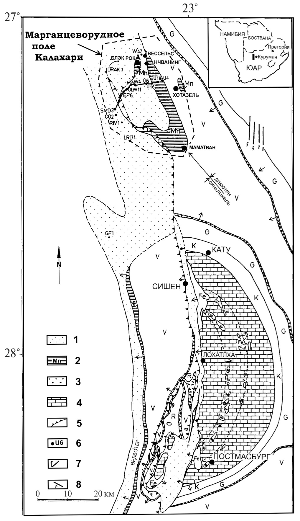 1–4 — отложения Трансваальской Супергруппы: 1 — формация Лукноу (базальные конгломераты, сланцы, кварциты, лавы андезито-базальтов), отделена перерывом от формаций Гамагара-Мопеди, 2 — подгруппа Вёлватер (доломиты, сланцы, железои марганцеворудные формации) и формация Онжелук (андезито-базальты), 3 — формация Макганиен (диамиктиты), 4 — подгруппа Кампбеллрэнд (карбонаты, редко — сланцы); 5 — надвиг; 6 — скважины; 7 — разломы; 8 — направление падения пластов.