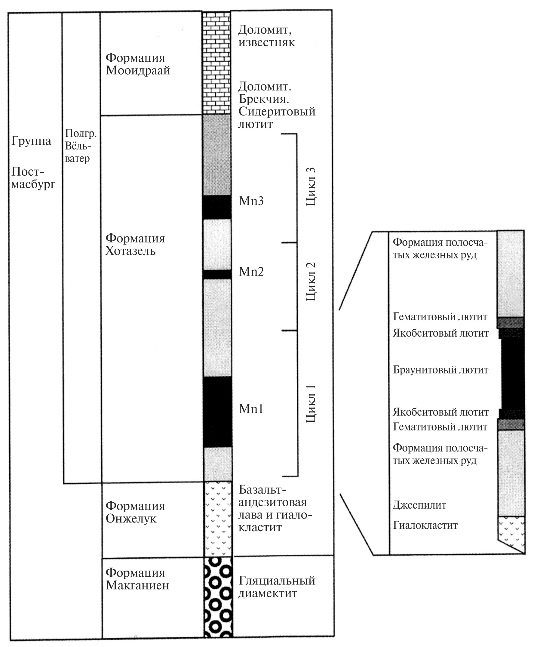 Рис. 2. Литостратиграфическая схема Подгруппы Вёльватер, участок шахты Хотазель [Gutzmer, Beukes, 2009].