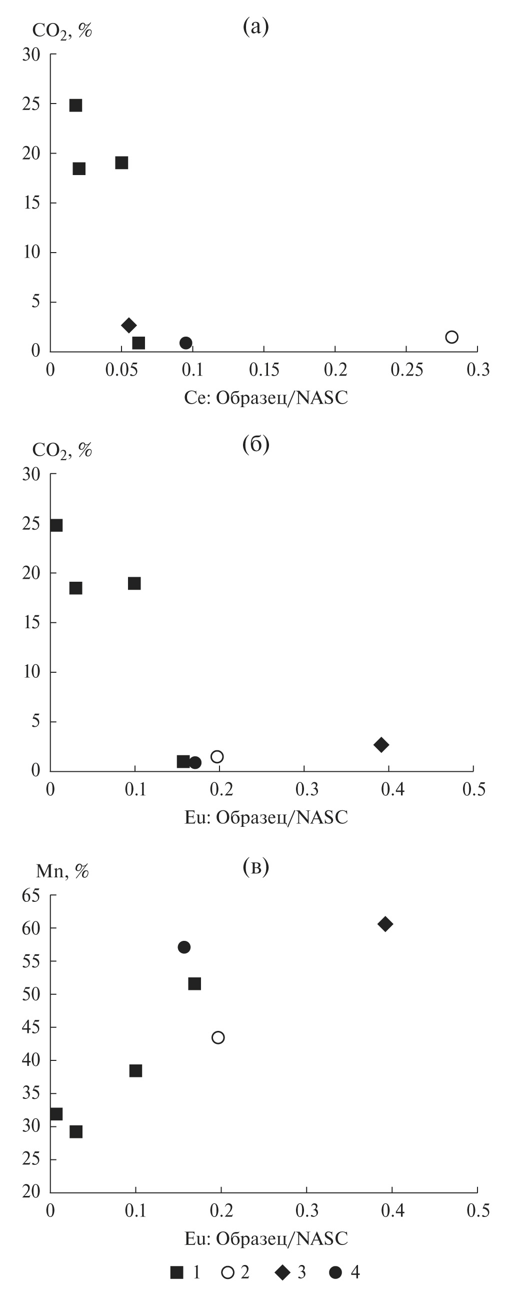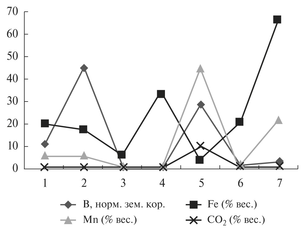 В рудах и железистых силицитах марганцевых месторождений МПК определены концентрации главных, редких и редкоземельных химических элементов (табл. 2, 3). Для нас представляло интерес выяснить особенности поведения данных элементов в процессе Mnи Fe-рудообразования.