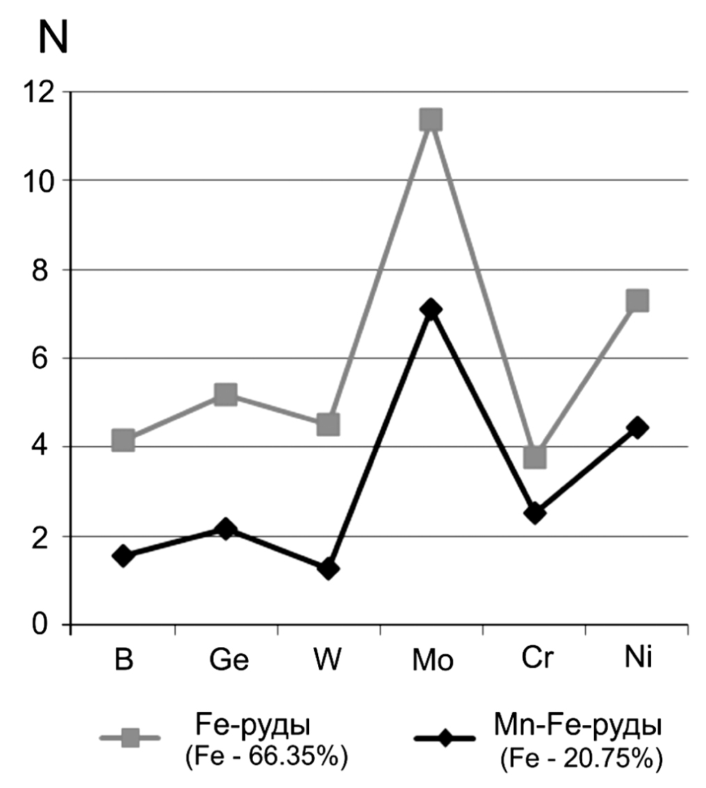 5. Fig. 4. Distribution of the mean contents of B, Ge, W, Mo, Cr, Ni normalized to the content of these elements in the Earth’s crust (N) [Rudnick, Gao, 2003], in Fe-Mn and Fe-ores of deposits of the Postmasburg area.