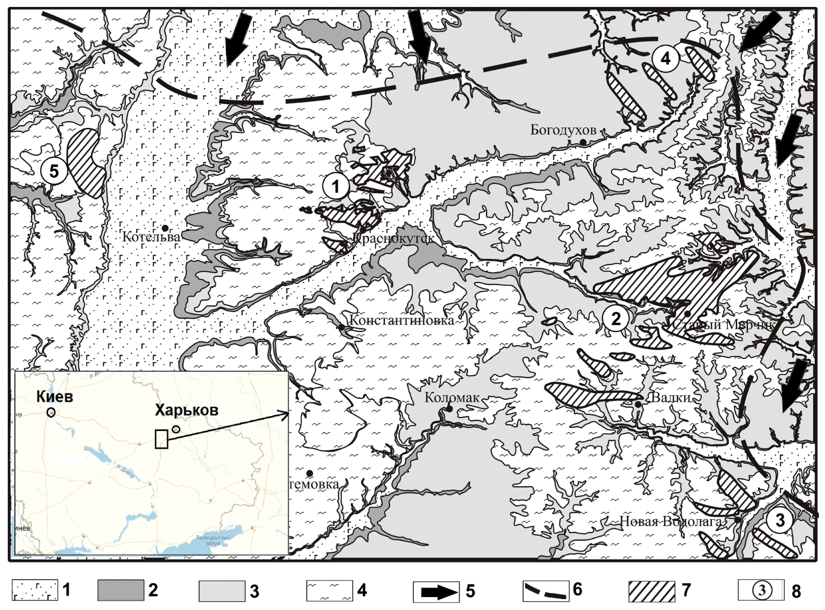 1 — средний олигоцен, межигорская свита, пески зеленовато-серые, глауконитовые, мелкозернистые; 2 — нижний миоцен, новопетровская свита, пески светло-серые, желтоватые, иногда с пестрой окраской, в верхней части каолинистые, мелко- и среднезернистые; 3 — верхний олигоцен, берекская свита, пески светло-серые, зеленоватые, с единичными зернами глауконита, мелкозернистые, в подошве глины зеленовато-серые, бурые с прослойками песка желтовато-зеленого, разнозернистого; 4 — верхний миоцен, толща пестрых и темно-серых глин; 5 — направление сноса титановых и циркониевых минералов; 6 — положение береговой линии в результате трансгрессии Субпаратетиса; 7 — контуры месторождений; 8 — месторождения редкометалльно-титановых руд (1 — Краснокутское, 2 — Мерчинское, 3 — Нововодолажское, 4 — Богодуховское, 5 — Куземинское).
