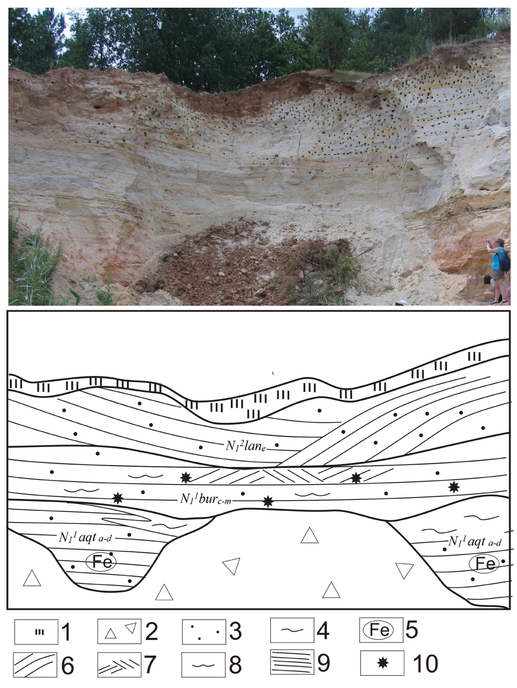 1 — почвенно-растительный слой, 2 — осыпи, 3 — разнозернистые пески, 4 — глинистые прослои, 5 — ожелезненные прослои, 6 — косослоистые серии повышенной мощности (более 0.5 м), 7 — перекрестная косая слоистость, 8 — знаки ряби, 9 — параллельная субгоризонтальная слоистость, 10 — обогащение темноцветными минералами. N11aqta-d — нижний миоцен, аквитанский ярус, аллювиально-дельтовый комплекс, N11burc-m — нижний миоцен, бурдигальский ярус, прибрежно-морской литоральный и мелководно-морской комплекс, N12lane — средний миоцен, лангийский ярус, эоловый комплекс.