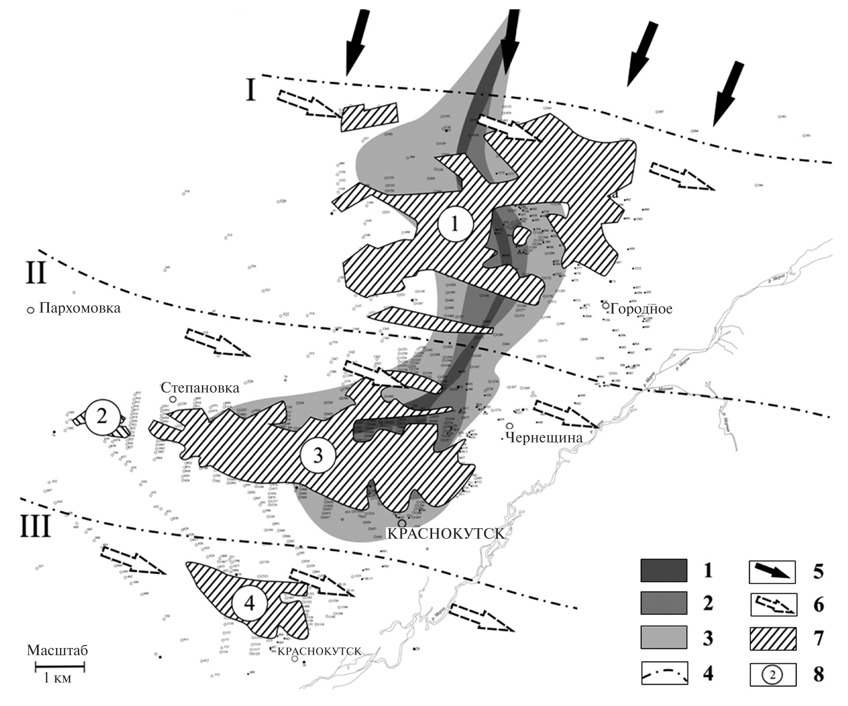 1‒3 — дельта: 1 — песок средне- и крупнозернистый, 2 — песок разнозернистый, мелко- и среднезернистый, 3 — глина; 4 — положение береговой линии на разных этапах регрессии бассейна (I–II–III); 5 — направление сноса рудного материала; 6 — движение вдольбереговых течений; 7 — контуры рудных залежей; 8 — рудные залежи (1 — Козиевская, 2 — Степановская, 3 — Центральная, 4 — Южная).