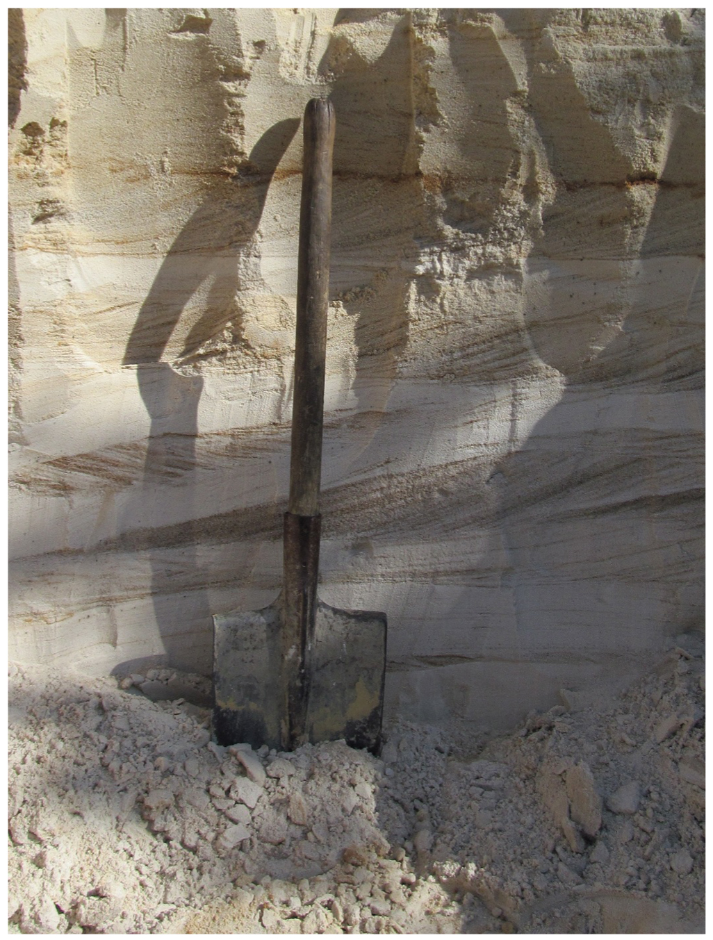 Отложения средненовопетровской подсвиты относятся к бурдигальскому ярусу нижнего миоцена и выделяются по характерной отчетливо выраженной слоистости и повышенной концентрации темноцветных рудных минералов. Окраска песков обычно светло-серая или серовато-белая, но встречаются участки с грязно-серой, розовой, желтой и ржаво-желтой окраской, обусловленной присутствием гидроксидов железа и глинистого материала. Отдельные пятна грязно-серой или буроватой окраски в ожелезненных песках, обусловлены привносом гумусированного материала реками в бассейн осадконакопления. Для песков средней подсвиты, развитых на исследуемой территории, характерна тонкая, отчетливо выраженная параллельная субгоризонтальная, волнистая и перекрестная косая слоистость со знаками ряби (рис. 2). Слоистость обусловлена, в основном, гранулометрическими различиями и колебаниями концентрации тяжелых темноцветных минералов. В нижней части толщи пески интенсивно ожелезнены и включают прослои глины (см. рис. 2).