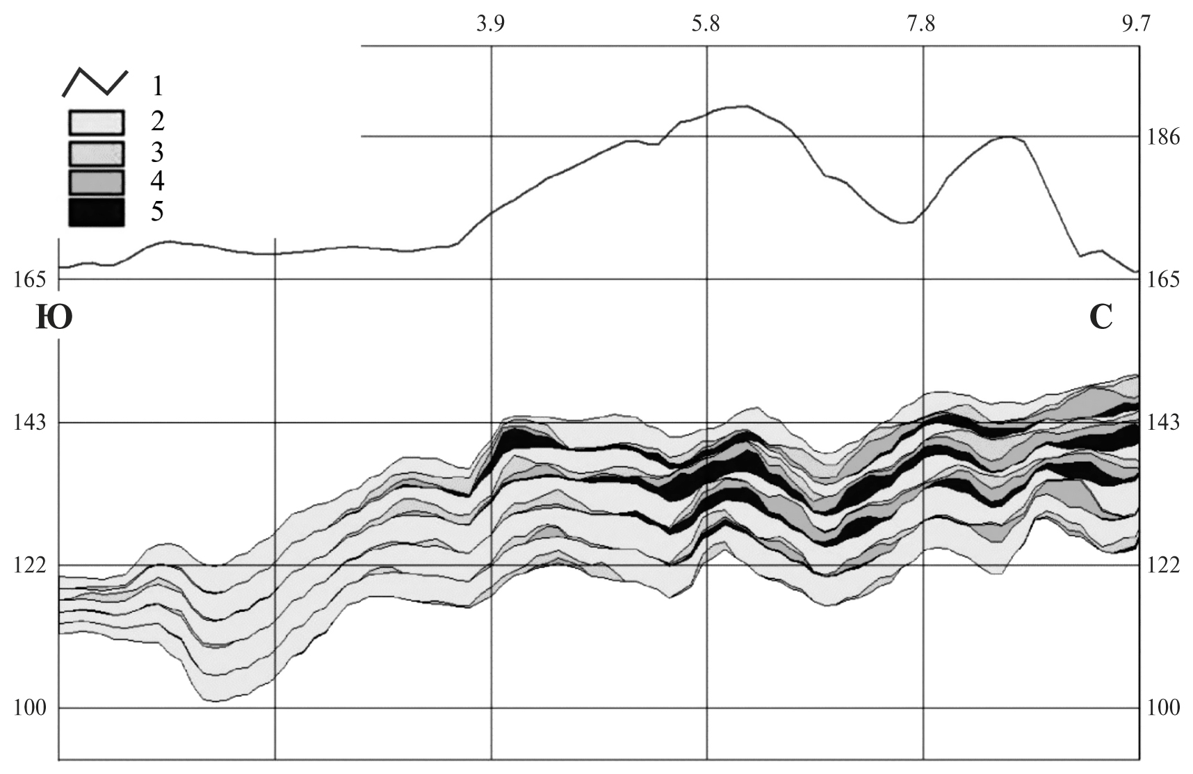 Следует особо отметить приуроченность полос рудных тел к флексуроподобным прогибам в рельефе подошвы средненовопетровской подсвиты (рис. 5). Линии простирания этих прогибов сосредоточены в пределах полосы максимальных концентраций тяжелых минералов, которая протягивается вдоль границы литоральной зоны и зоны верхнего (надводного) пляжа. Также необходимо отметить высокую степень расчлененности рельефа на площади Центрального участка месторождения, что способствовало локализации структурно-седиментационных ловушек рудного материала вкрест простирания линии палеоберега.