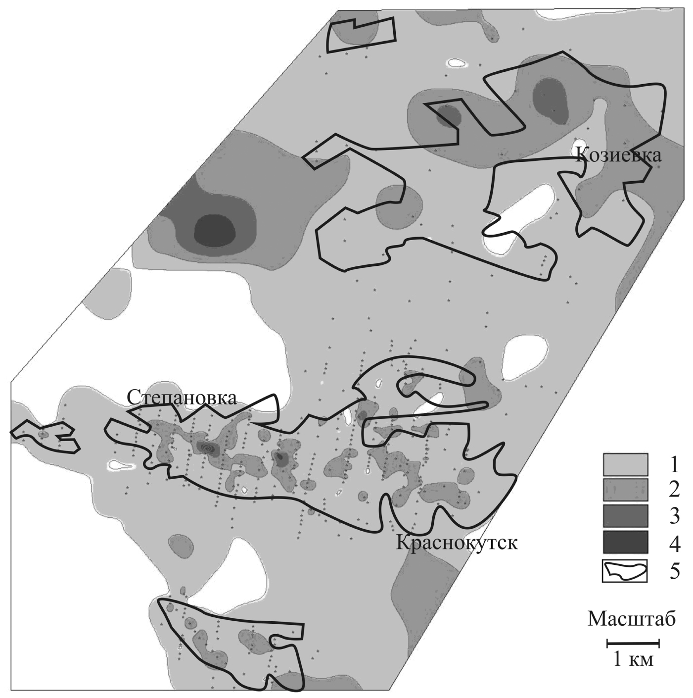 1 — дневная поверхность; 2–5 — выход коллективного концентрата, кг/м3: 2 — 0–5, 3 — 5–8.5, 4 — 8.5–19, 5 — более 19.