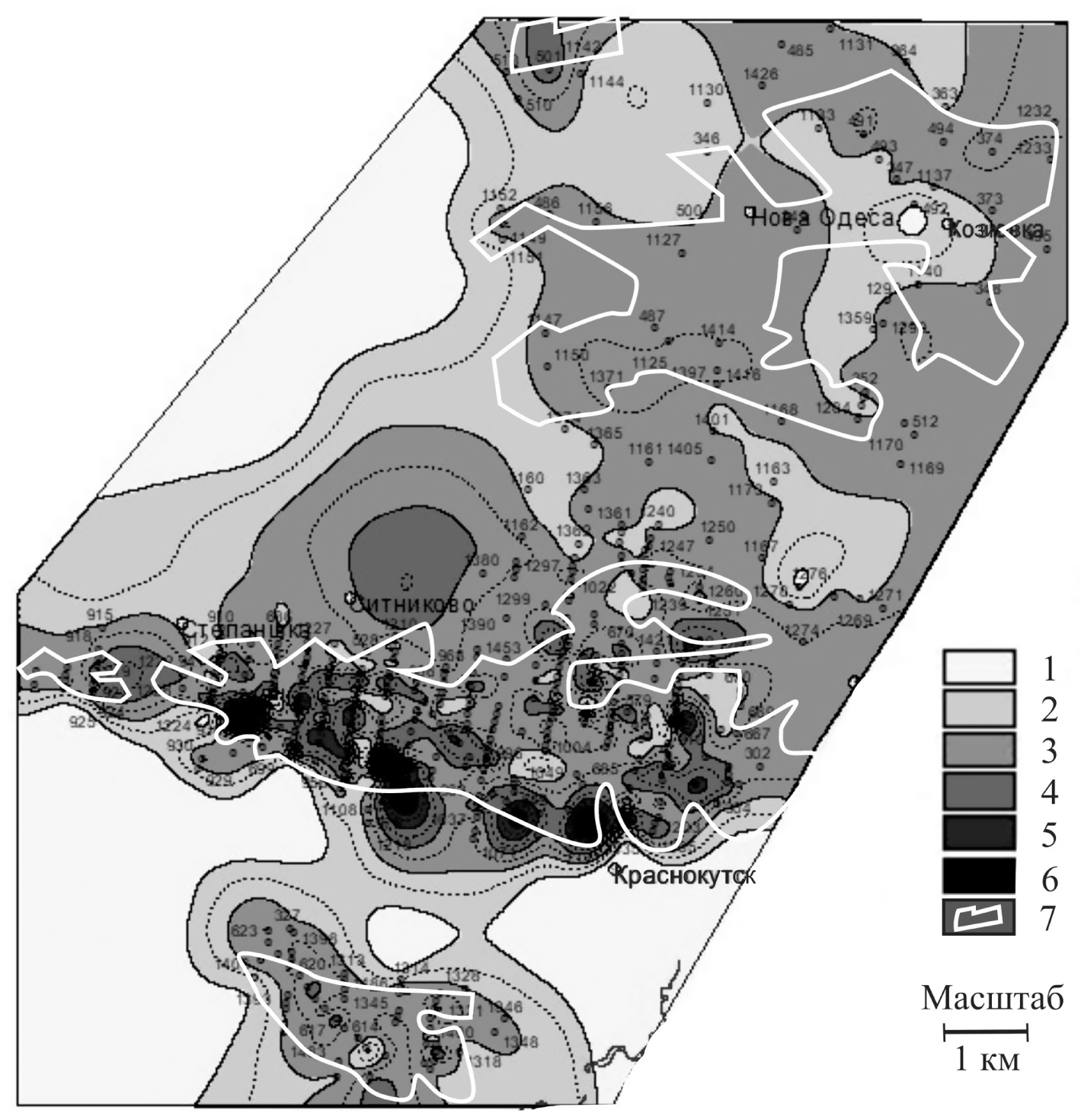 Рис. 6. Карта распределения мощностей рудной толщи Краснокутской россыпи.