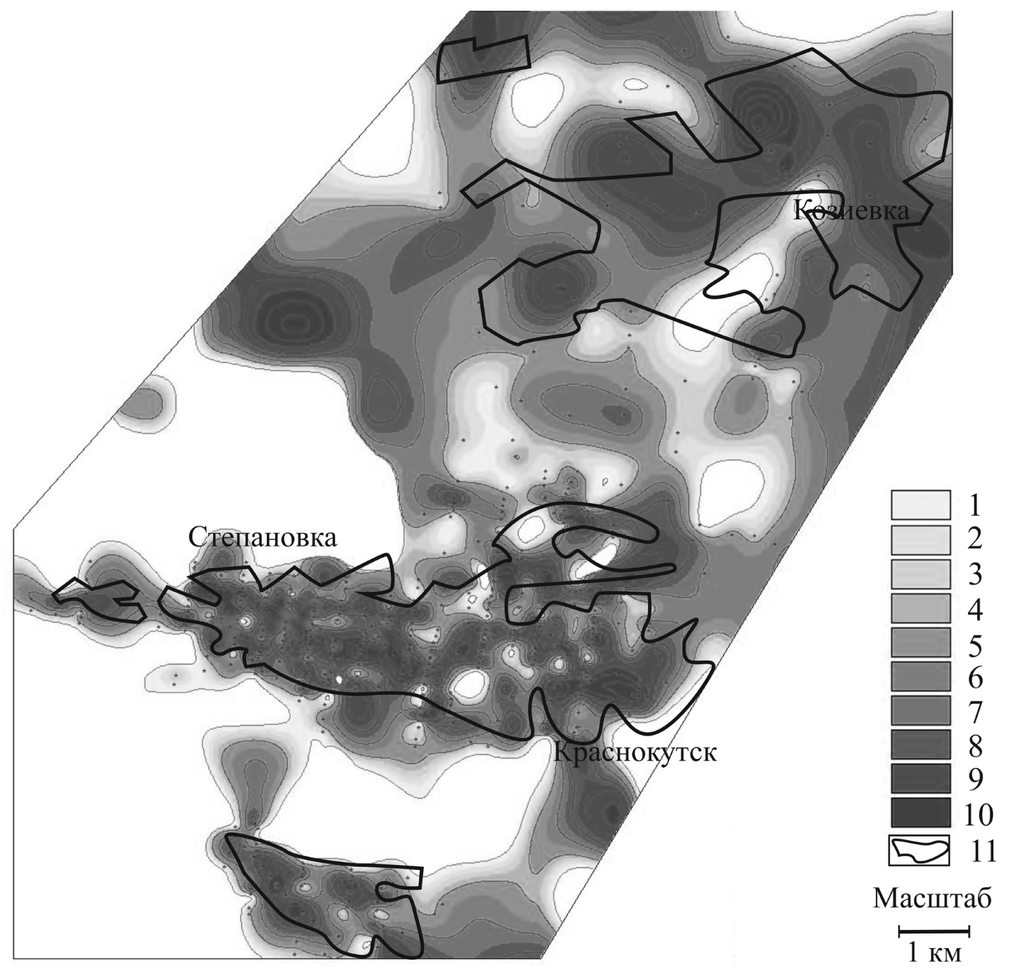 Карта распределения удельных запасов коллективного концентрата (рис. 8) показывает абсолютные значения объемного веса (кг) определенных градаций запасов на единицу площади (м 2). В пределах полигона выделяют те же зоны: протяженная субширотная максимальных значений (отвечает Центральному участку), ограниченная субизометрическая максимальных значений (Южный участок) и две зоны повышенных значений (протяженный субширотный — Козиевский участок, который включает две линзы повышенных значений в центральной и восточной частях, а также ограниченная зона Степановского участка). Согласно карте, преобладающая часть запасов с градациями более 20 кг/м 2 относится к Центральному участку [Кравченко, Хрущев, 2015].