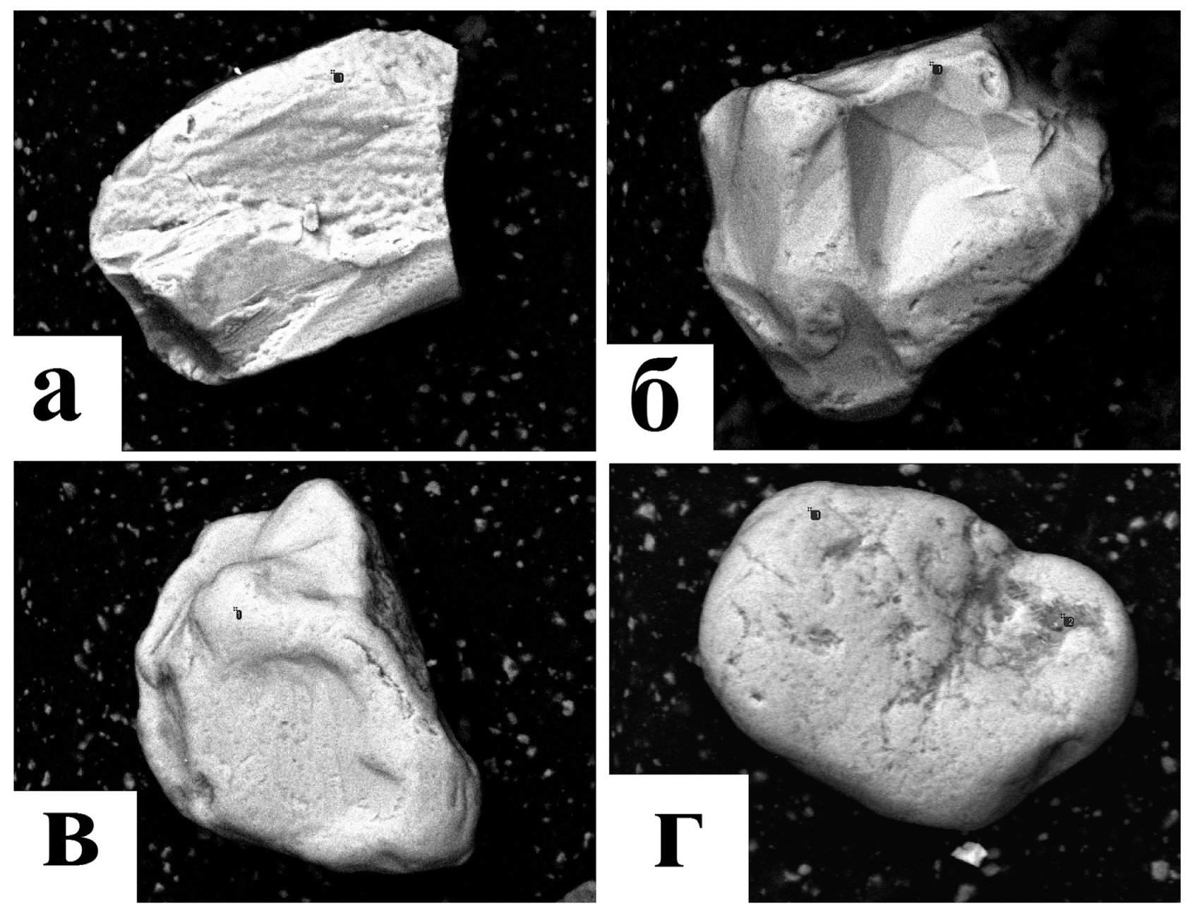 Рис. 9. Морфологические типы измененного ильменита — лейкоксена Краснокутской россыпи: угловатый обломок кристалла псевдорутила из аллювиально-дельтовых отложений, Kв = 1.67 (а); среднеокатанные зерна измененного ильменита из прибрежно-морских отложений с Kв = 2.7 (б) и с Kв = 4.8 (в); хорошо окатанные зерна лейкоксена из эоловой толщи, Kв = 36.6 (г).