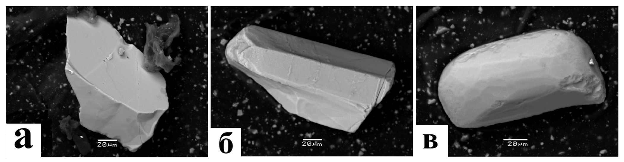 Рис. 10. Морфологические типы зерен рутила Краснокутского меторождения: угловатые слабоокатанные обломки кристаллов (а), идиоморфные слабоокатанные кристаллы преимущественно призматического габитуса (б), среднеокатанные зерна (в).