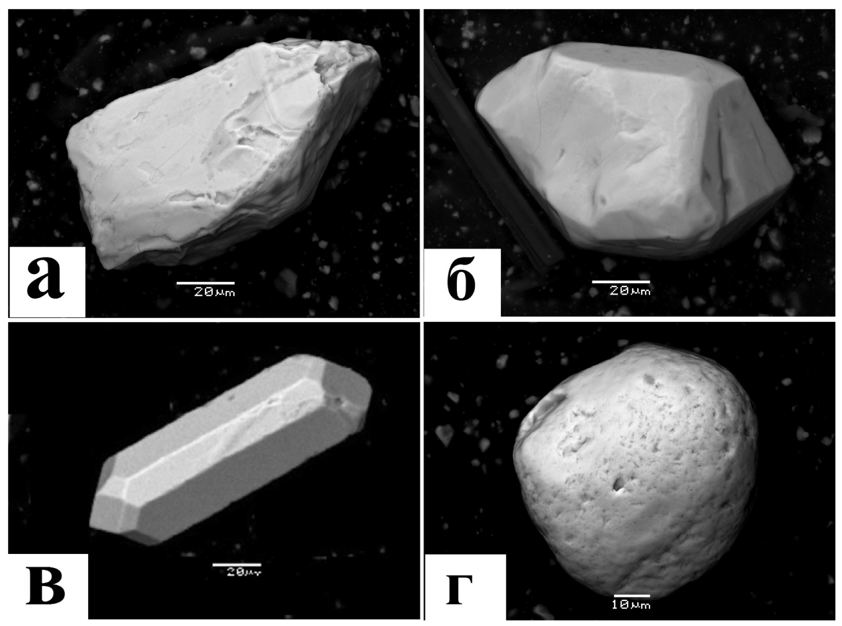 Рис. 11. Морфология зерен циркона. Слабоокатанные обломки (а), идиоморфные изометричные слабоокатанные зерна (б), удлиненные призматические зерна (в), хорошо окатанные обломки и идиоморфные кристаллы (г).