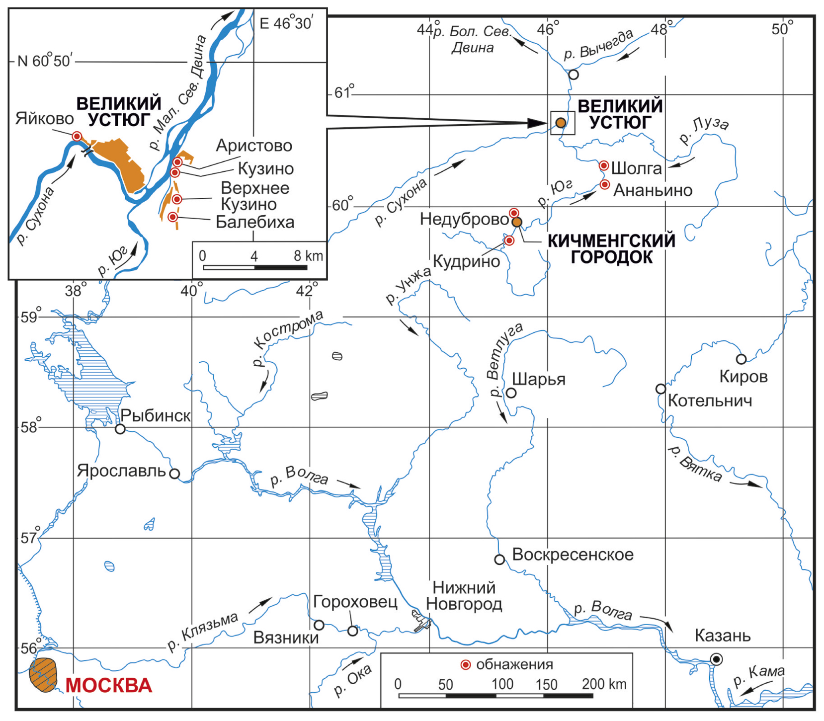 Объекты исследования. Для выяснения особенностей палеоэкологических обстановок, существовавших во время формирования континентальных образований рубежа перми и триаса, нами был изучен изотопный состав углерода и кислорода в генетически различных карбонатах (педогенных, осадочных и органогенных), отобранных на обширной территории Московской синеклизы: от бассейна р. Вятки на востоке до Верхнего Поволжья на западе и бассейнов рек Сухона и Юг на севере. Основное внимание было уделено разрезам северо-восточной части МС (рис. 1) вскрывающимся в береговых обрывах рек Малая Северная Двина, Юг, Сухона и их притоков [Arefiev et al., 2015; Арефьев и др., 2016а, б].