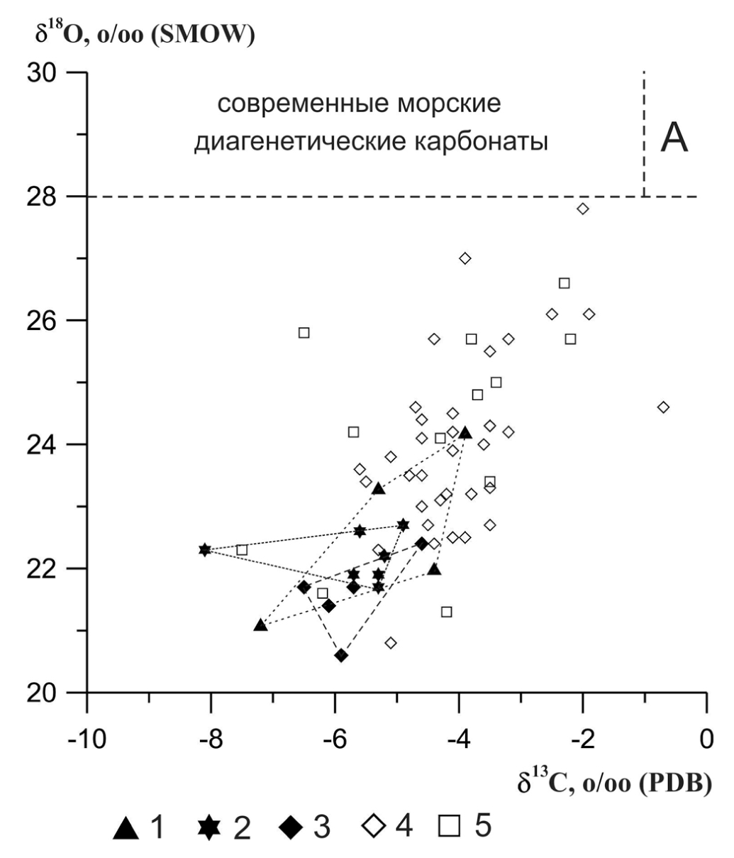 Для изотопных исследований отбирались карбонатные пробы, изученные макроскопически и с использованием оптического микроскопа, без признаков гипергенных изменений, раскристаллизации и новообразований (прожилков и «залеченных» трещин).