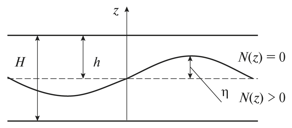 Мы рассматриваем двухслойный океан постоянной глубины H, ограниченный твердыми дном и поверхностью (рис. 1). Плотность воды , будучи непрерывной, постоянна, , в верхнем слое толщиной и равна в нижнем слое толщиной , где — постоянная средняя толщина однородного слоя и — отклонение границы раздела между слоями. Сумма определяет равновесный профиль плотности в нижнем слое, отклонение предполагается малым, . В линейном приближении уравнения, определяющие эволюцию такой системы, записываются в виде: