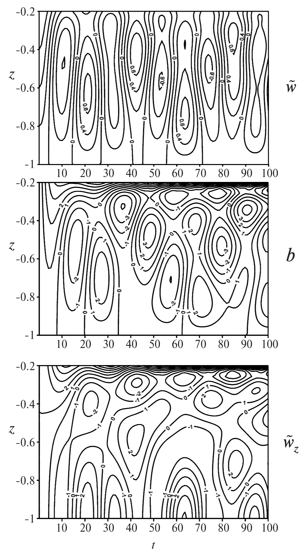 Из (42) видно, что погранслойная вертикальная скорость мала, и именно поэтому погранслойная структура не видна в поле на рис. 2. Вместе с тем в силу (43), (45) соответствующие горизонтальные скорости и плавучесть порядка единицы быстро осциллируют по z, при этом их вертикальные градиенты растут пропорционально t. Толщина пограничного слоя уменьшается с ростом t пропорционально 1/ t. Отметим также, что асимптотические выражения для и различаются только коэффициентом и совпадают при . Это объясняет сильное подобие пограничных слоев в полях плавучести и горизонтальной скорости () на рис. 2.