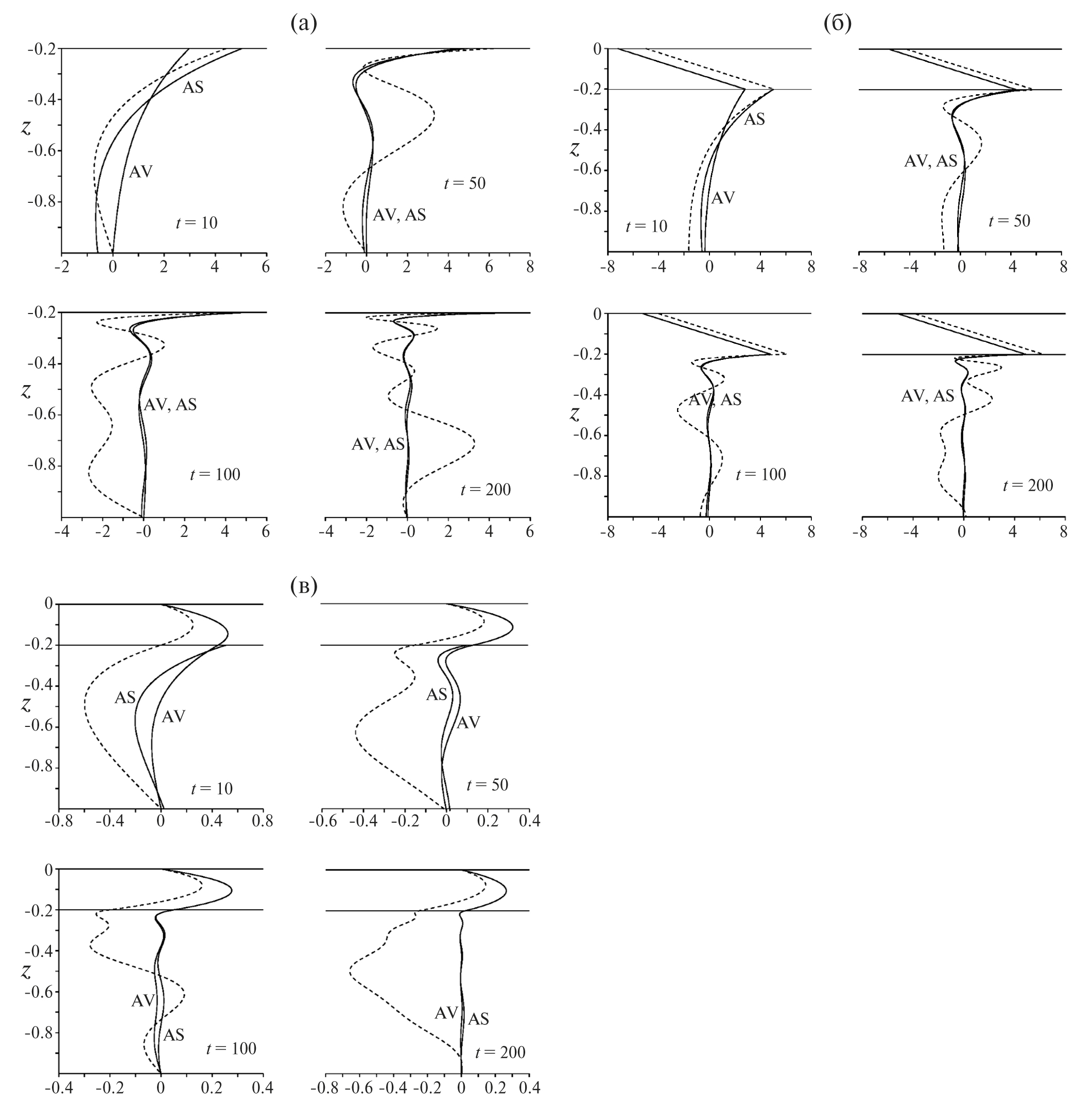 Цель численных экспериментов — сравнить точные осредненные поля (46) с их асимптотическими представлениями (42), (43), (45) и поведением мгновенных полей (28), (30) и . Результаты расчетов для в различные моменты времени представлены на рис. 3. Пунктиром изображены профили мгновенных полей , сплошными линиями — асимптотические (АS) и точные (AV) профили осредненных полей . Асимптотические профили представлены в нижнем стратифицированном слое. Рисунки демонстрируют, что асимптотики (43), (45) неплохо согласуются с точными полями при , мало отличаются от них при и практически неотличимы от точных осредненных полей при и далее. Видно, что осредненные поля действительно имеют погранслойную структуру, все сильнее поджимаясь к границе раздела между слоями с течением времени и стремясь к нулю внутри области в соответствии с рассмотренным выше асимптотическим решением. Этот процесс сопровождается сильным ростом вертикальных градиентов плавучести и горизонтальной скорости () вблизи границы раздела. Мгновенные профили со временем не затухают и становятся все более и более изрезанными, причем максимальные вертикальные градиенты (еще более резкие, чем в осредненных полях) развиваются в окрестности границы раздела. Для сравнения на рис. 3в приведены мгновенные, осредненные и асимптотические профили вертикальной скорости (28), (31), (42а), в которых элементы погранслойной структуры выражены очень слабо.
