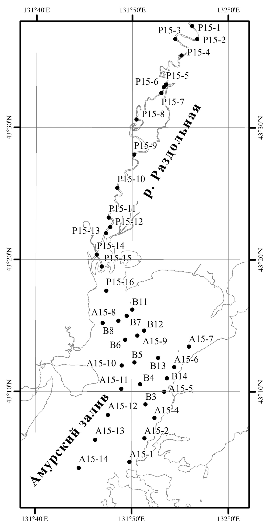 Донные осадки отбирали в Амурском заливе (август 2014, июль 2015 г.), на разрезе р. Раздольная — Амурский залив (июль 2015 г.) (рис. 1) через 10 дней после прохождения тайфуна ”Чан–Хом”, в результате которого за короткий промежуток времени выпало до 67 мм осадков. Порядковые номера станций речных осадков и почвы совпадают (станции Р1–П1 и т. д.), но станции отбора почв не отмечены, чтобы не загромождать схему. Параллельно в реке отобрали воду с поверхностного горизонта.