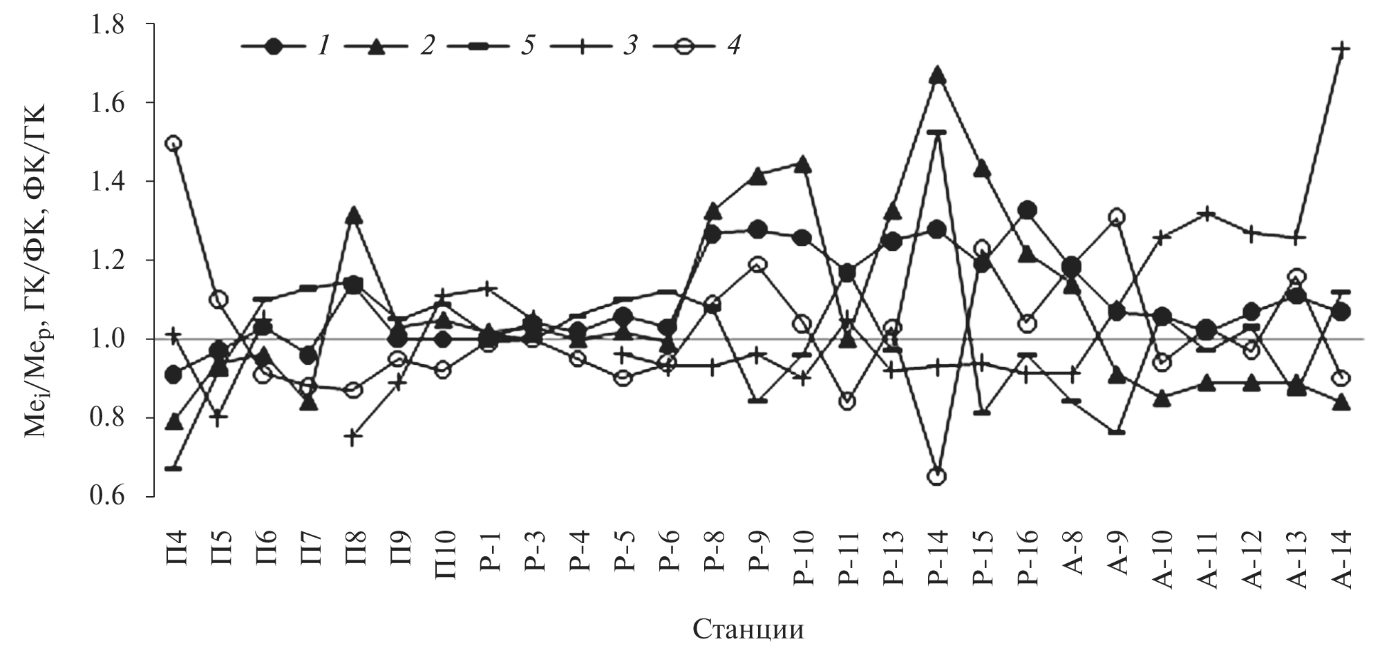 Рис. 2. Распределение отношений Mei/Meр для Fe (1), Mn (2), Сорг (3) и ГК/ФК (4), ФК/ГК (5) в субколлоидной фракции донных отложений на разрезе река–море.