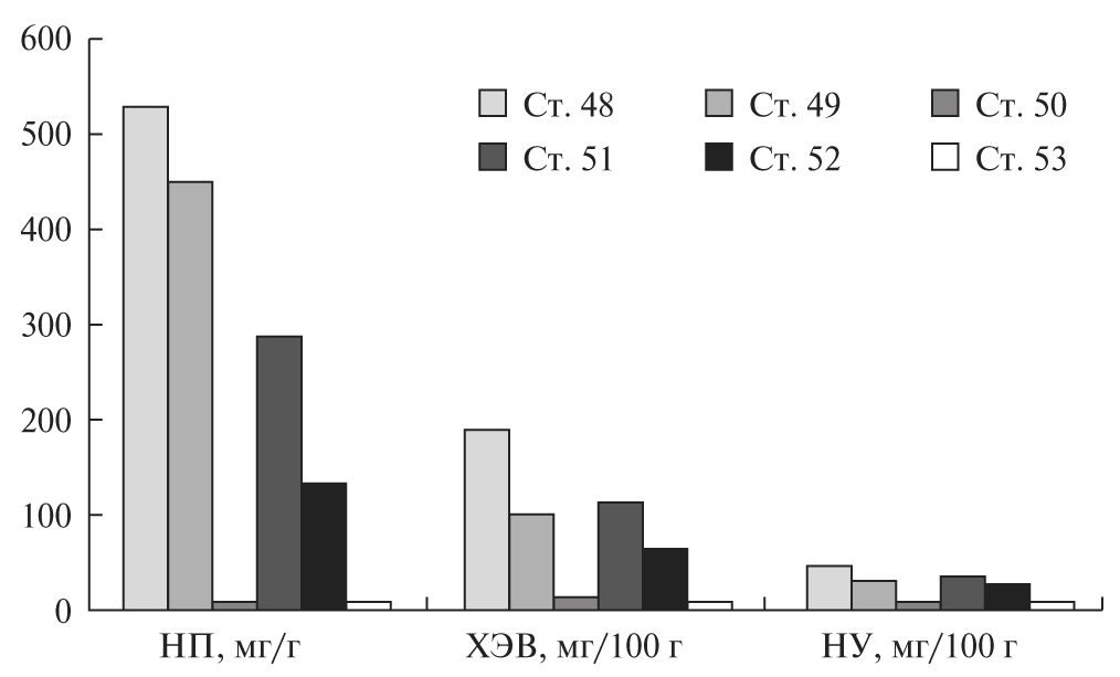 Содержание НУ в донных отложениях колебалось в пределах от 2.1 до 43.3 мг/100 г. Наиболее загрязненными были станции 48 и 49. Наименьшее содержание НУ отмечено на станциях 50 и 53. В целом зафиксированные уровни их содержания можно оценить как невысокие, характерные для прибрежных районов городов. Нормативы РФ по содержанию НУ в донных отложениях отсутствуют, но в европейских странах подобные величины уже разработаны. Исходя из них, предельно-допустимая концентрация (ПДК) НУ составляет 5 мг/100 г [17]. Таким образом, превышение ПДК по данному показателю в исследуемом районе отмечено на станциях 48, 49, 51, 52. На остальных точках пробоотбора превышения данного показателя не выявлено.