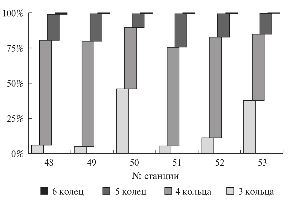 Во всех пробах выделено 16 полиароматических соединений. Содержание таких из них, как нафталин, бифенил, 2-метилнафталин, флуорен, аценафтен и антрацен было следовым. Процентное соотношение идентифицированных ПАУ в донных отложениях по станциям б. Казачья приведено на рис. 5. В среднем по полигону наибольшая массовая доля (73.5%) определенных полиаренов приходилась на 4-ядерные соединения, в основном относящиеся к канцерогенам, поступающим в окружающую среду в результате антропогенного воздействия [13]. Токсичные соединения, содержащие 2–3 кольца, практически отсутствовали. Наибольшее содержание 3-ядерных полиаренов было на станциях 50 и 53 (46 и 38% соответственно). На остальных — их доля не превышала 11%. На станциях 48, 49, 51, 52, находящихся в восточной части бухты, существенно преобладали соединения с 4 кольцами с примерно одинаковой долей 70–75%. Именно в этом районе располагается поселок и полигон военного транспорта.