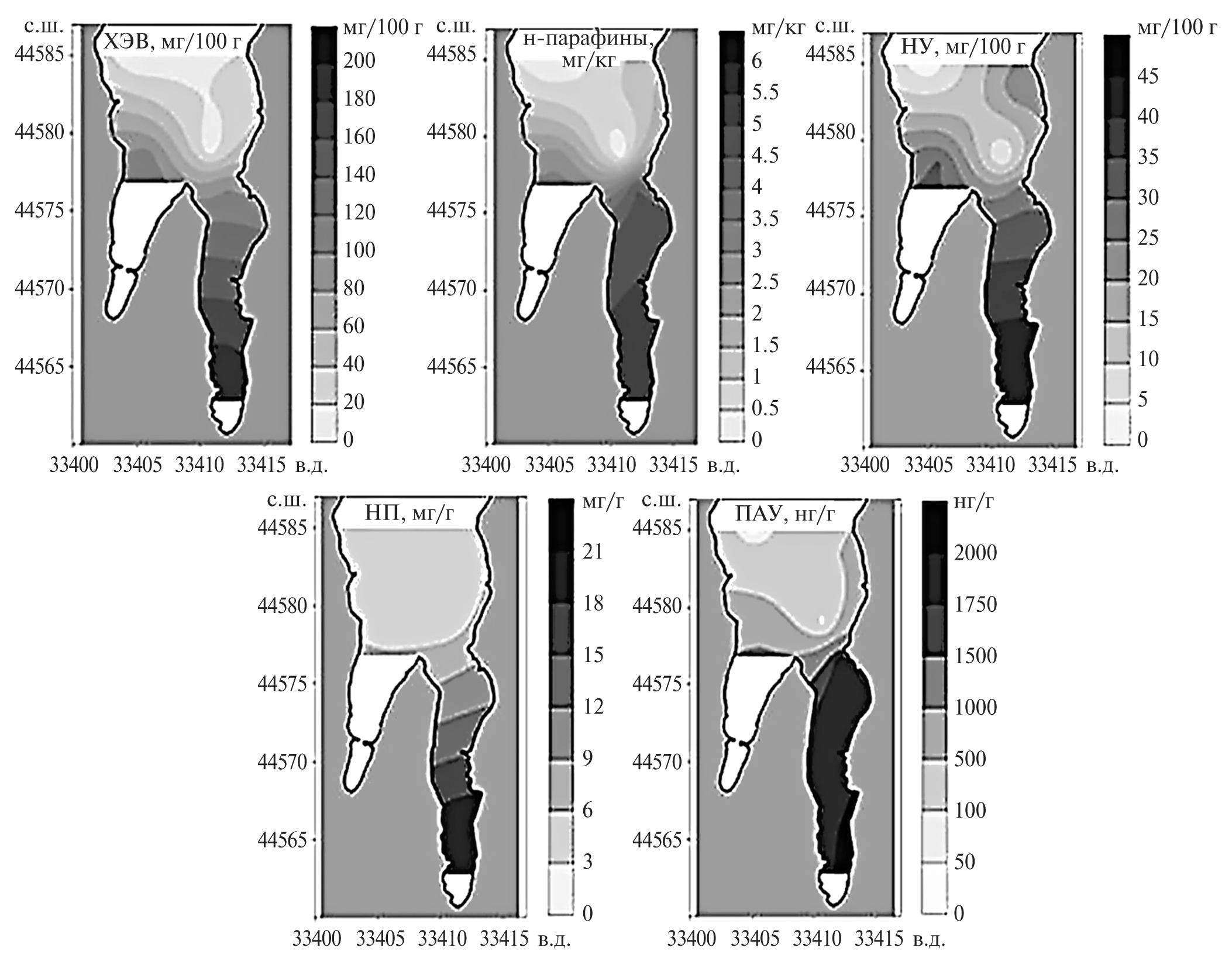 Можно подытожить, что в результате усиления антропогенного пресса в кутовой и центральной частях акватории отмечены следующие признаки загрязнения донных отложений: — в вершинной части отмечены максимальные концентрации ХЭВ, не характерные для данной акватории и III уровень загрязнения из 5 возможных; — высокое процентное содержание НУ от ХЭВ; — повышенное содержание парафинов в диапазоне С14–С16; — концентрации ПАУ выше характерных для черноморских донных отложений; — высокое содержание 4-ядерных полиаренов (в среднем по акватории до 73.5%); — соотношение фенантрен-антрацен и флуорантен-пирен характерны для ПАУ антропогенного происхождения; — данные участки по содержанию ПАУ характеризуются как сильнозагрязненные.