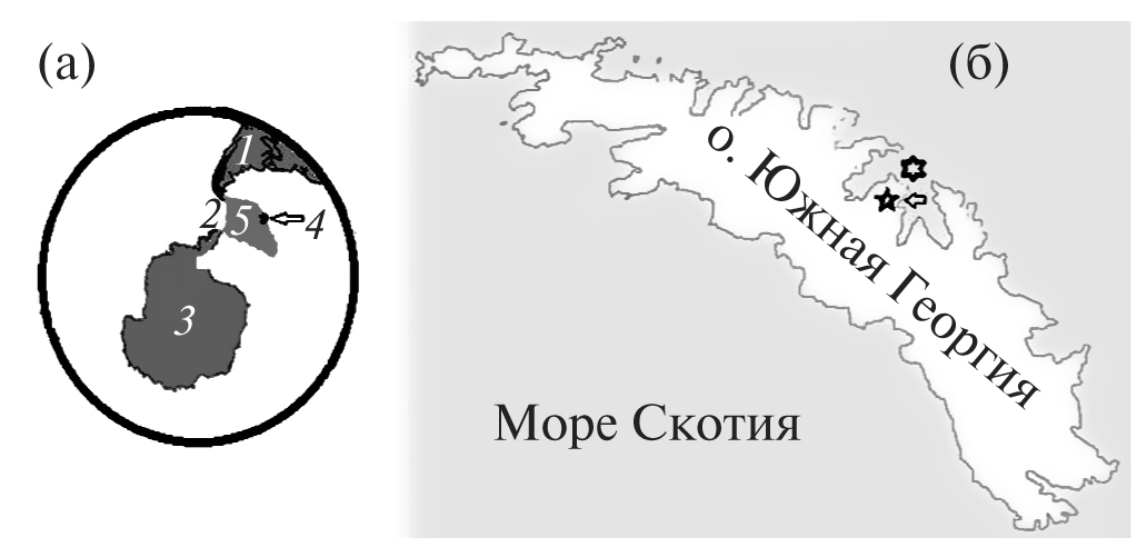 Рис. 1. Местоположение о. Южная Георгия (а) и бухты Кинг Эдуард (б).
