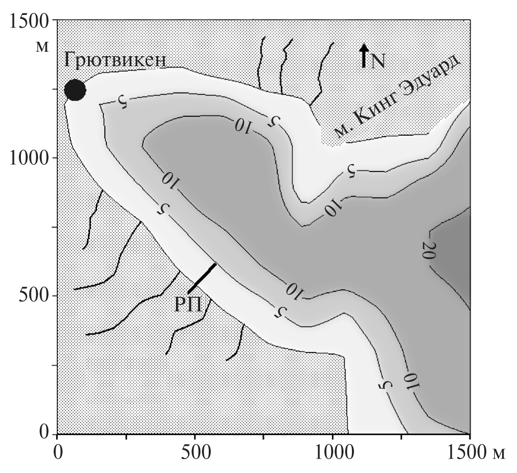 Бухта Кинг Эдуард вдается в сушу примерно на 1 км при средней ширине около 500 м. Глубины вдоль ее оси и на входе составляют около 20 м (рис. 2). В процессе геолого-геоморфологического изучения полуострова Тэтчер установлено, что происхождение бухты предопределено разломно-блоковой неотектонической структурой (рис. 3), обусловившей опускание ее литологического ложа с наклоном от кутовой части к устью. Боковые берега принадлежат к дифференцированно поднимающимся блокам со скоростью, которая даже на аккумулятивных участках достигает 1.7 мм/год. При этом на основании оригинальных данных установлено, что уровень моря в голоцене не превышал сколько-либо заметно его современного положения [1].