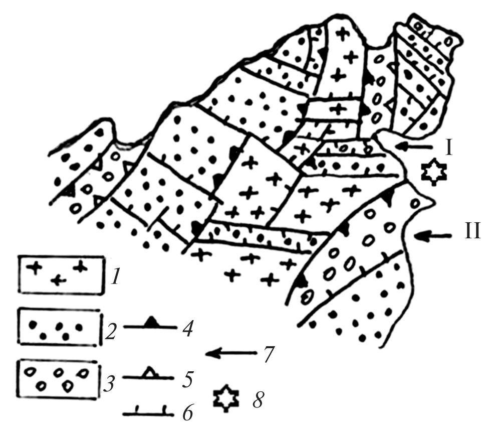 Районы орогенической активизации соответственно морфометрии: 1 — повышенной (>500 м), 2 — умеренной (500–200 м), 3 — слабой (200–0 м). Границы структурных элементов: 4 — первого порядка, 5 — второго порядка, 6 — блоковой фрагментации. 7 — район непосредственных наблюдений: на участке I выполнено математическое моделирование литодинамики береговой зоны; на участке II выполнены детальные геолого-геоморфологические исследования с целью определения кинематики уровня моря в позднем голоцене; 8 — б. Кинг Эдуард.