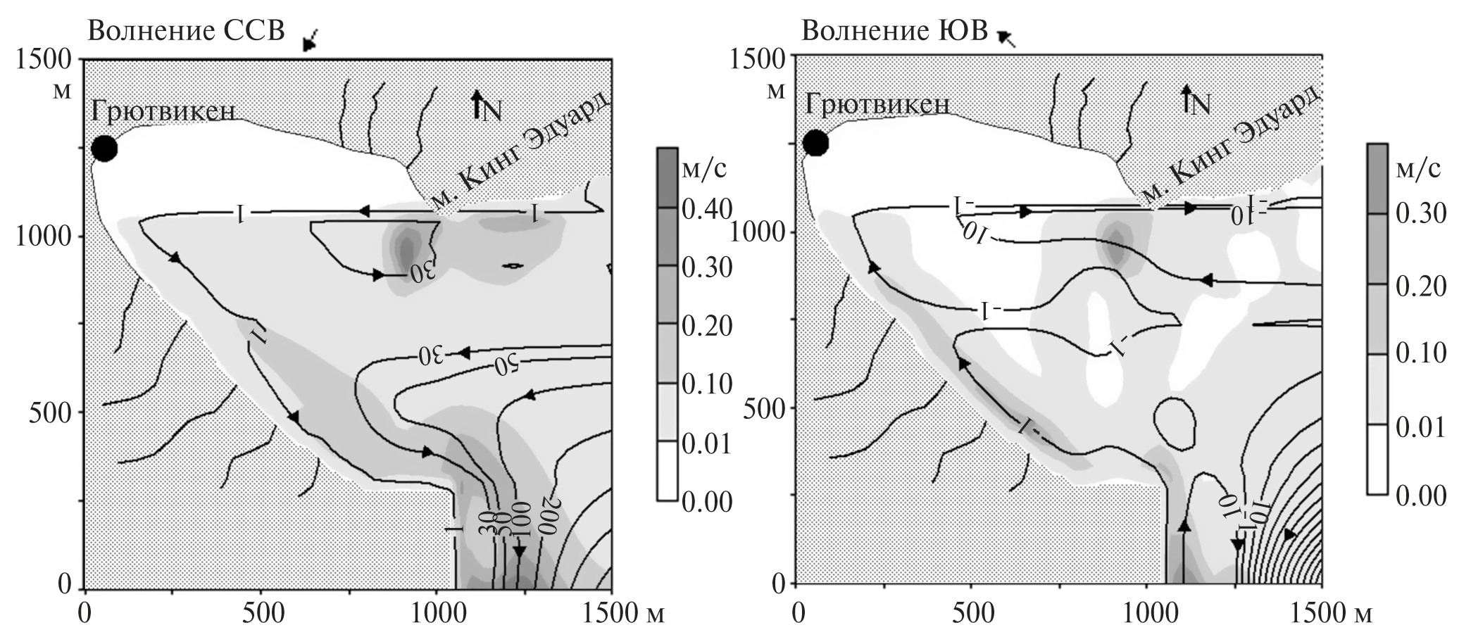 Рис. 4. Циркуляция воды в бухте Кинг Эдуард при океанском (ССВ) и локальном (ЮВ) волнении.
