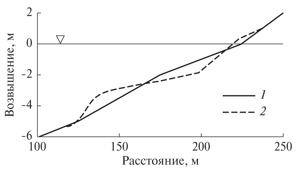 Для оценки возможных смещений береговой линии воспользуемся правилом Брууна (2). На выбранном профиле (РП на рис. 2) штормовые деформации дна рассчитывались для условий воздействия океанских волн, охарактеризованных в таблице. Средняя высота таких волн, подходящих к песчаному берегу при экстремальном шторме, по расчетам составляет 1.3 м, а угол подхода — около 30°. Вид исходного профиля дан на рис. 5. Здесь же показан профиль, выработанный 6-часовой работой шторма. Принятая продолжительность воздействия достаточно типична для пика шторма, когда его параметры сохраняют максимальные значения.