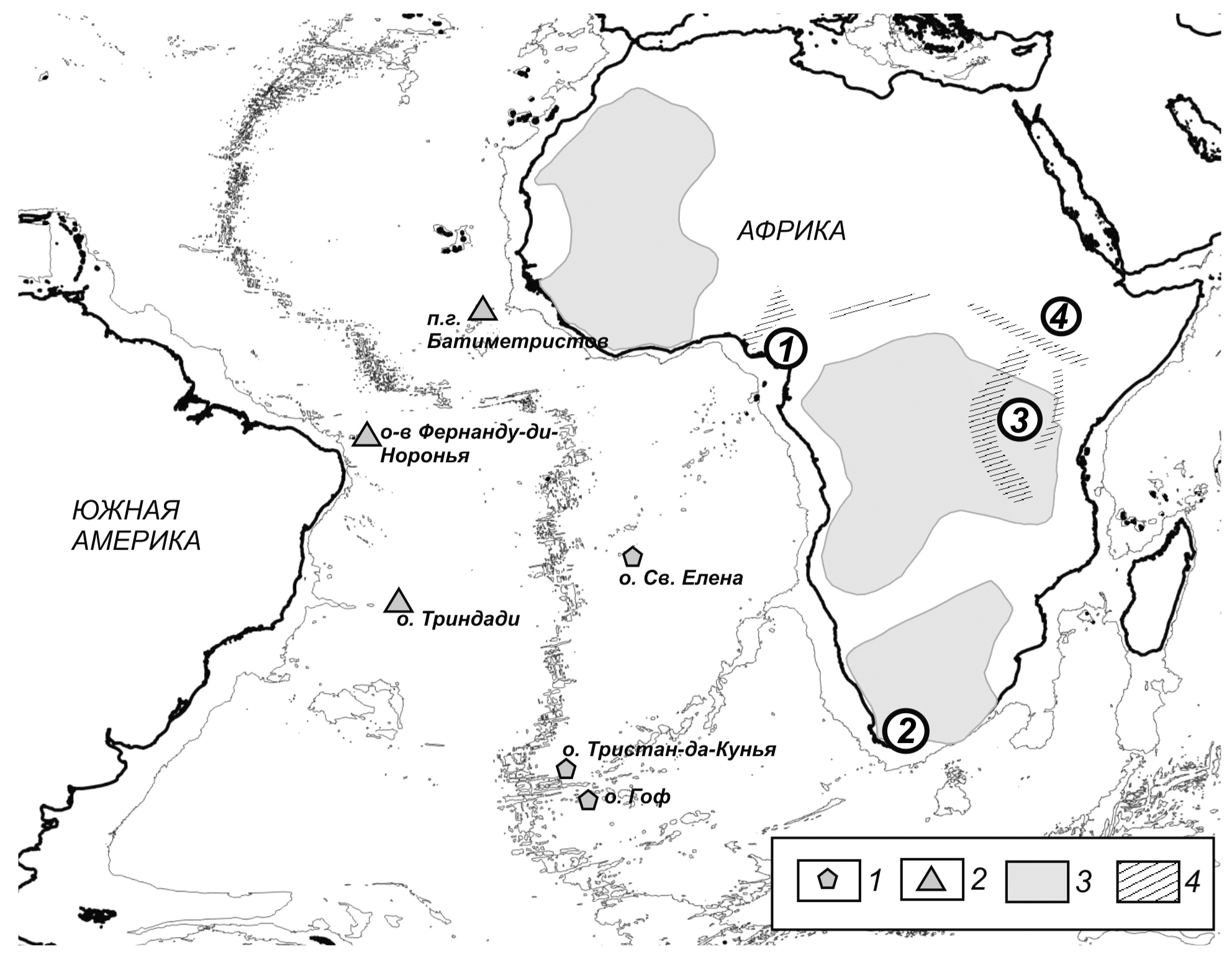 Рис. 1. Схема размещения изученных вулканитов: 1 — океанические острова Южной Атлантики: Тристан-да-Кунья, Гоф, Святая Елена; 2 — острова и подводные горы вблизи континентальных окраин Южной Америки и Африки: Фернанду-ди-Норонья, Триндади, подводные горы Батиметристов; 3 — кратоны; 4 — рифтовые зоны Африки (в кружках): 1 — рифт Камерун, 2 — юго-западный мыс Африки, 3 — область Восточно-Африканских рифтов, 4 — рифт Туркана.