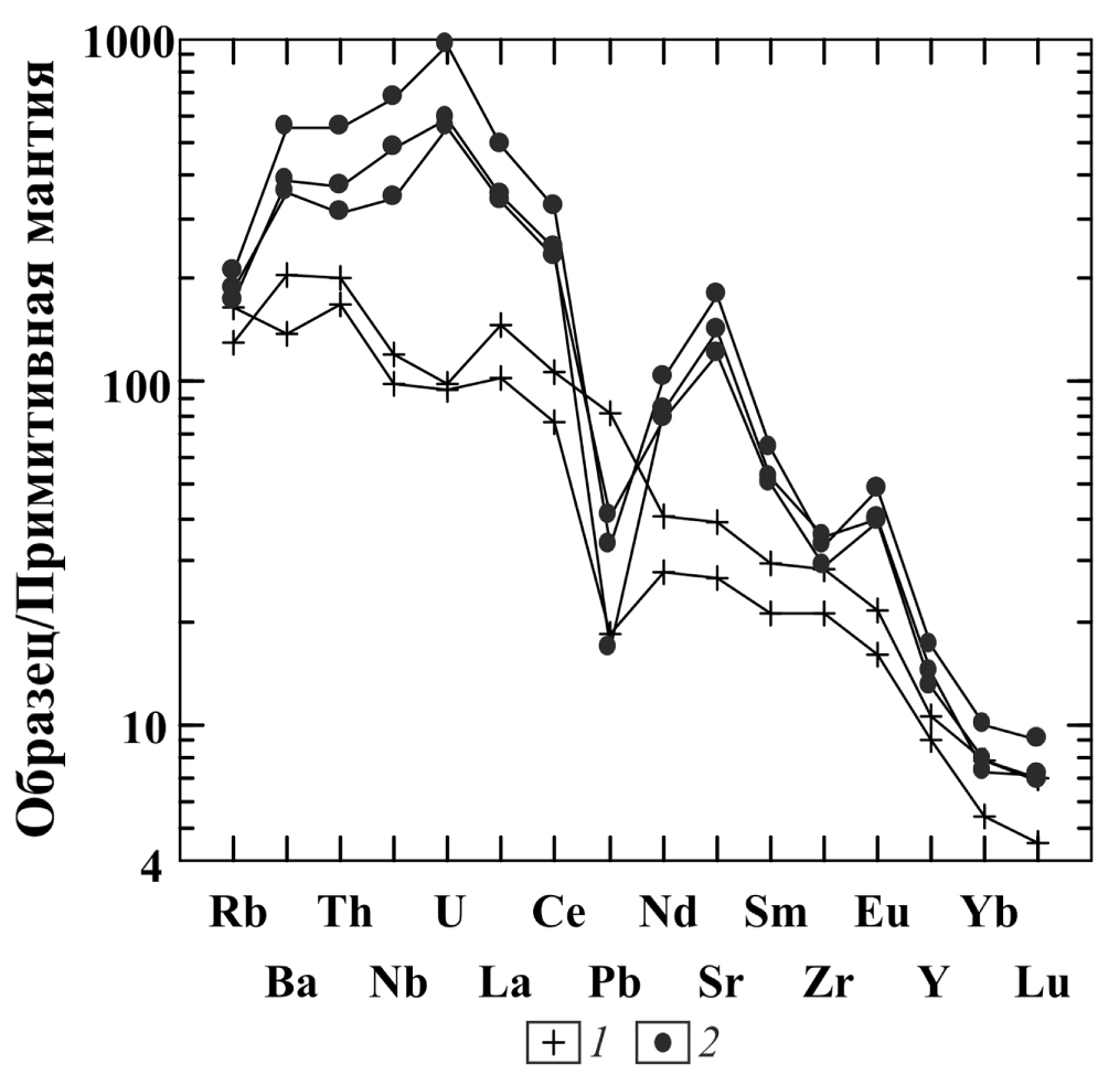 Рис. 2. Различия в составе мелилититов (2) и базальтов (1) в лавовом поле Ньирагонго, Западный рифт Африки [15, 34]. Распределение элементов-примесей, нормализованных по примитивной мантии [32].
