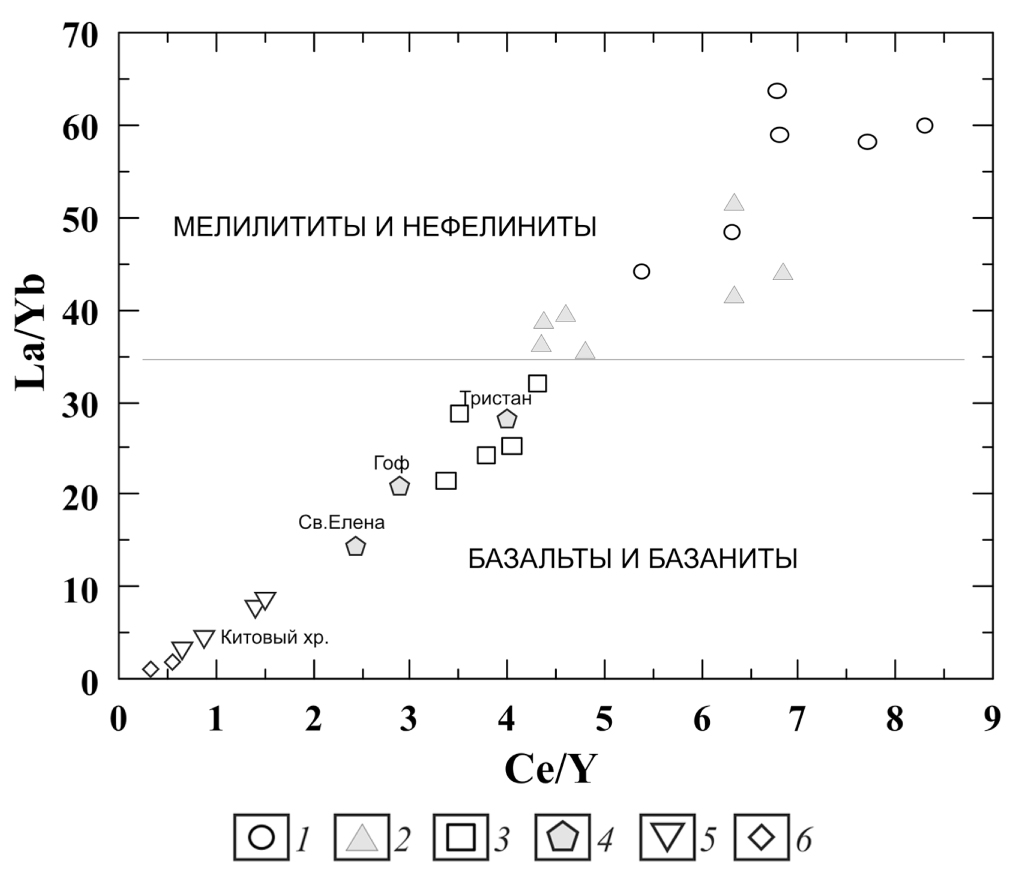 Поскольку мы рассматриваем наиболее близкие к первичным магмам образцы пород, они отражают содержания элементов-примесей, изначально свойственные данному типу магм, а не модифицированные в ходе эволюции. Изменения величин отношений концентраций характерных редких элементов в изучаемых типах вулканитов отражают изменения в режиме выплавления магм и специфику их источников [4, 23 и др.], что хорошо видно из табл. 3. Уровень обогащенности магм редкими элементами отражен в более высоких значениях отношений La/Yb и Nb/Y в мелилититах и пониженных — в базальтах. Изменение величины отношения Ce/Y [17] показывает уменьшение глубины выплавления магм от мелилититов к базальтам, а величина отношения Sm/Y [31] свидетельствует о генерации мелилититов в поле гранатовых перидотитов, а базальтов — на границе гранатовой и шпинелевой фаций глубинности перидотитов. Степень плавления мантийного субстрата коррелирует с изменением отношения Zr/Nb: оно обычно несколько выше для базальтов. Таким образом, петрологические и геохимические признаки обеих групп вулканитов согласуются между собой. Наиболее наглядно различия между данными типами вулканитов отражены на графике Ce/Y — La/Yb (рис. 3).