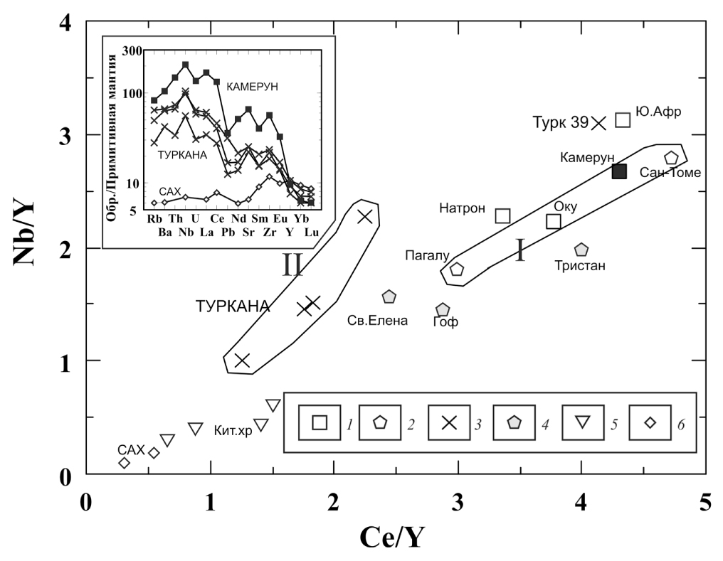 Исследования эволюции составов базальтов в рифтовой депрессии Туркана (т. 4 на рис. 1), разделяющей Эфиопское и Восточно-Африканское плато [19, 20], а также в меридиональной тектонической зоне к востоку от нее [29] показали, что режимы растяжения, деформации и эрозии континентальной плиты по мере удаления от кратонных областей приводят к изменению состава базальтов вплоть до весьма обедненных. В молодых базальтах рифта Туркана (II на рис. 4) по мере уменьшения глубины выплавления (величина отношения Ce/Y изменяется от 2.3 до 1.3) в базальтах снижаются показатели обогащенности расплавов: величины отношений La/Yb убывают от 13.6 до 7.1; Nb/Y — от 2.3 до 0.99. Составы вулканитов постепенно сдвигаются в сторону толеитов Красного моря [1]. Интересно отметить, что более древние базальты с возрастом 39 млн лет [20] в районерифта Туркана (Турк 39 на рис. 4) по составу близки базальтам вулкана Камерун и ЮЗ мыса Африки, что определенно указывает на плавление в тот период континентальной плиты большей мощности. Состав литосферной плиты при этом имеет одинаковые характеристики на восточной и на западной окраинах Африки, отсутствуют аномалии в поведении Nb и Pb в базальтах (рис. 4, врезка).