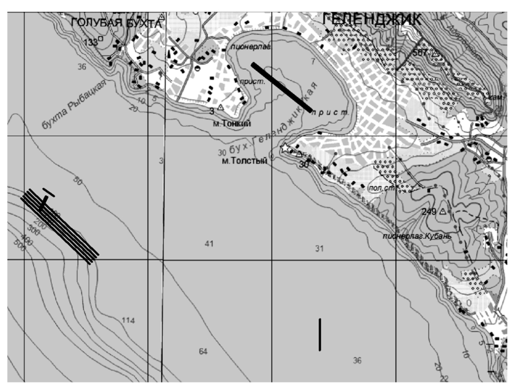 Схема движения судна по исследовательским галсам приведена на рис. 1. Cбор и обработка батиметрических данных осуществлялись с помощью программы Hypack. Имевшееся программное обеспечение позволяло строить карты глубин исследовательских полигонов путем «сшивки» эхолотных данных, полученных при движении судна по сетке параллельных и пересекающихся галсов. При этом межгалсовое расстояние составляло от 25 до 50 м, что обеспечивало сплошное перекрытие исследуемой области на дне. Общая площадь отснятых полигонов составила около 2 кв. км, полная длина промера составила около 35 пог. км.