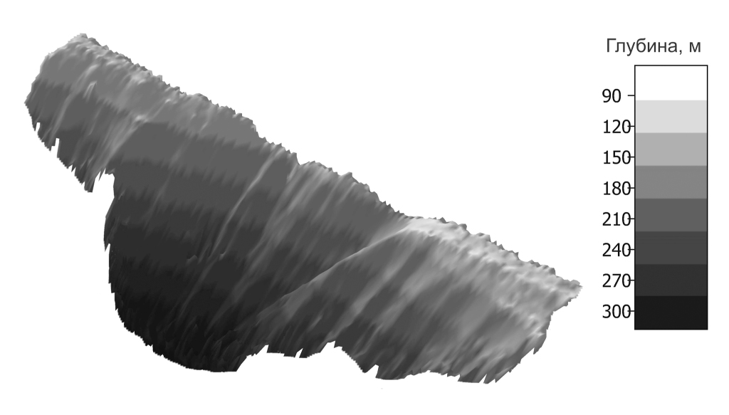 Рис. 2. Трехмерное изображение батиметрии участка переходной зоны от шельфа к материковому склону.