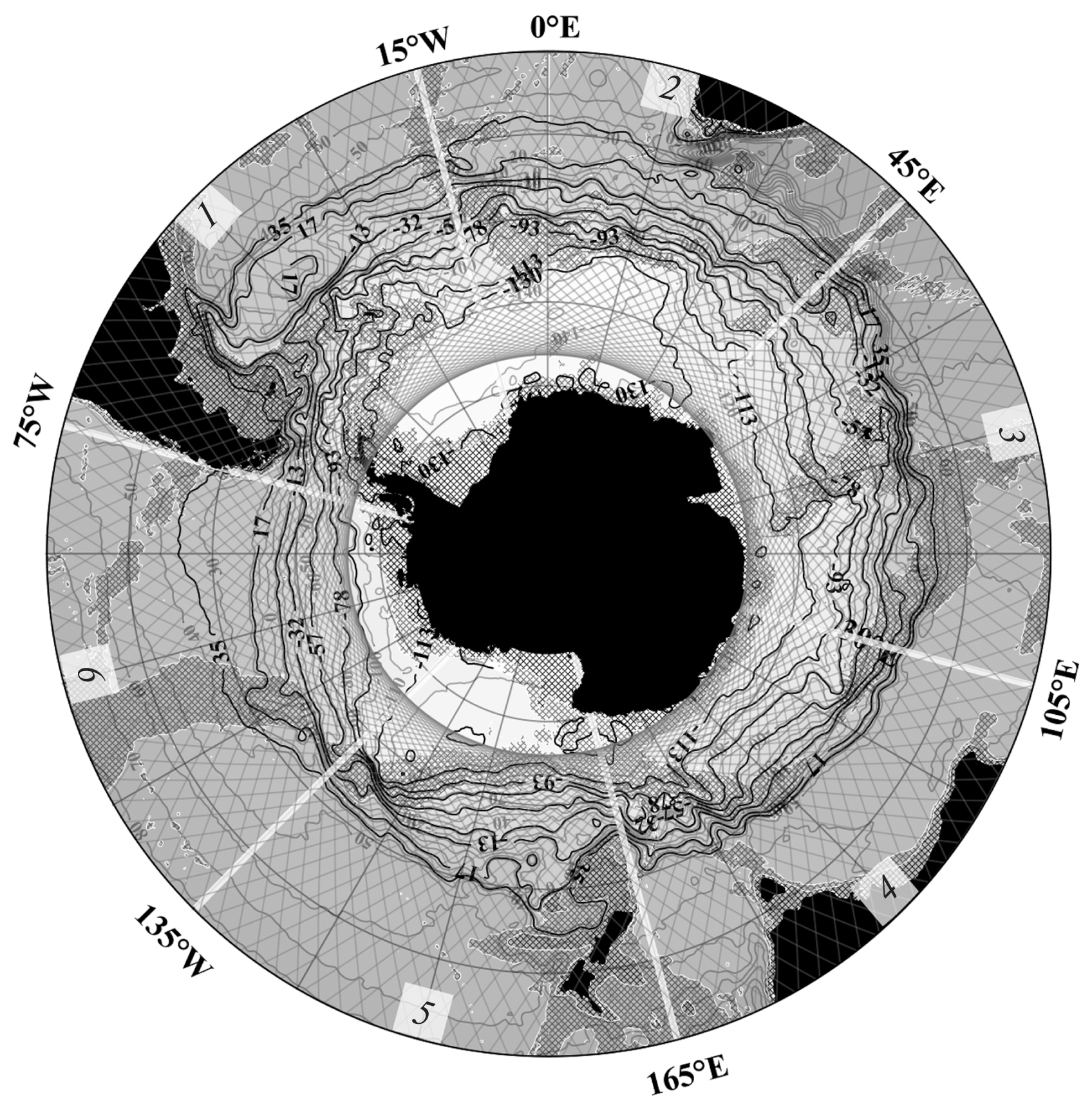 Рис. 1. Средняя за 1993–2015 гг. карта АДТПО (см) Южного океана (до 30° ю. ш.). Выделены изогипсы, являющиеся граничными между струями АЦТ (см. таблицу). Жирная штриховая линия — северная граница распространения циклонических вихрей струй АЦТ в секторе 2. Темная и светлая клетки соответственно показывают участки дна с глубиной менее 1000 м и от 1000 до 3000 м. Показаны секторы Южного океана: 1 — Западно-Атлантический; 2 — Восточно-Атлантический; 3 — Индийский; 4 — Австралийский; 5 — Западно-Тихоокеанский; 6 — Восточно-Тихоокеанский. Приведены также треки основной орбиты спутников-альтиметров с наклонением 66°.