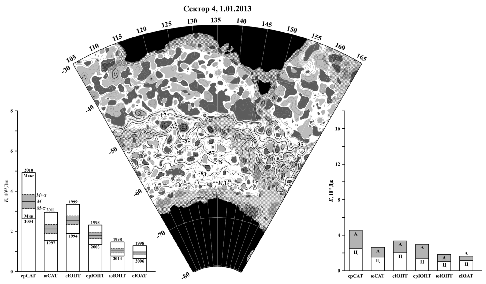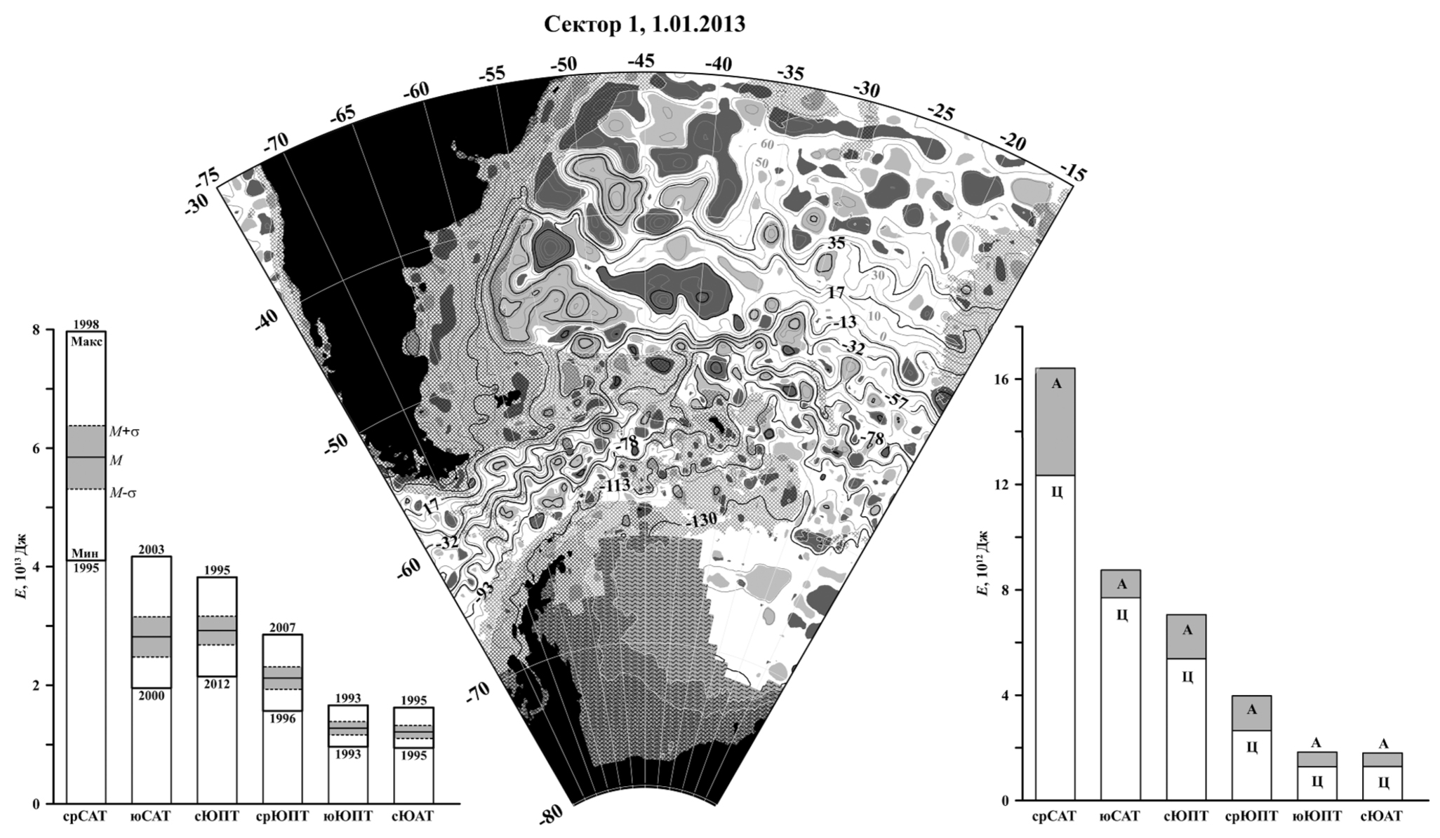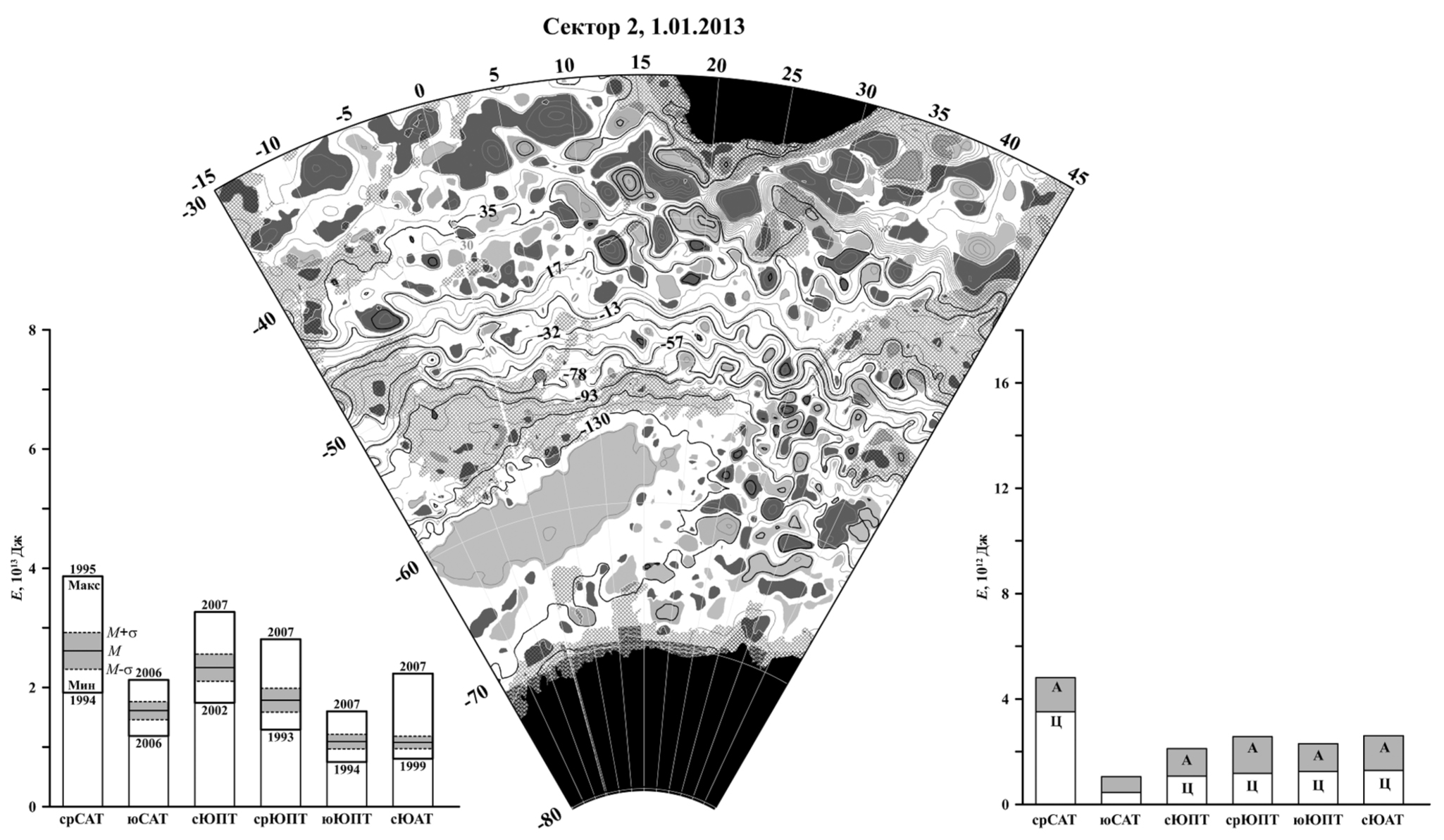 В отличие от всех остальных секторов антарктического кольца, в секторе 2 циклонические вихри в диапазоне АДТПО, характерном для АЦТ, формируются также за счет отрыва меандров Агульясского и продолжающего его Бенгельского течений, которые направлены соответственно на запад и северо-запад вдоль континентального склона Африки (напр., [4, 6]). Для учета этого обстоятельства при расчете средних энергий вихрей различных струй АЦТ в этом секторе (рис. 3, справа внизу) зона проникновения вихрей АЦТ была ограничена изогипсой 35 см, разграничивающей циркуляционные системы Агульясского течения–Агульясского противотечения и АЦТ (рис. 1).