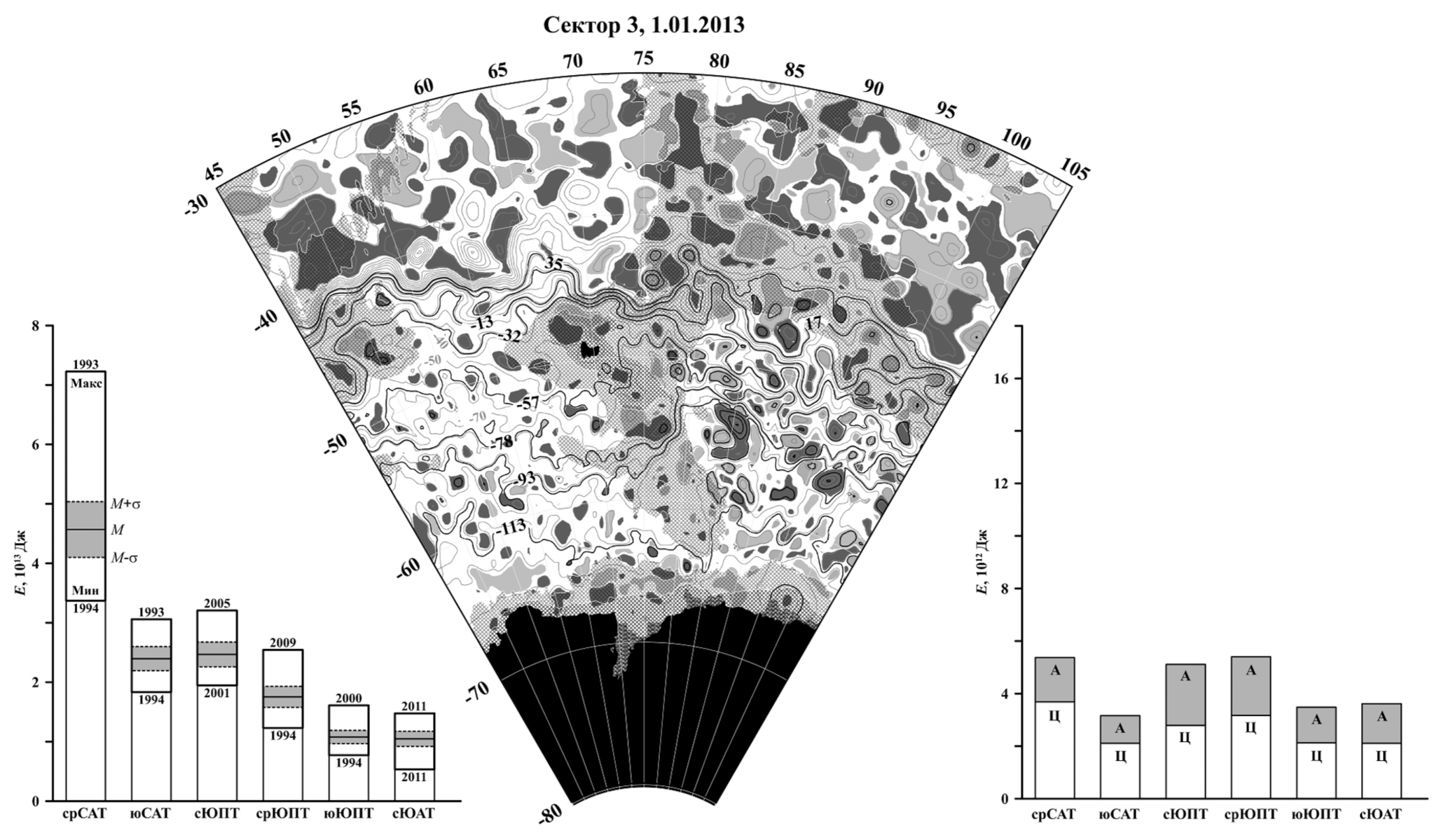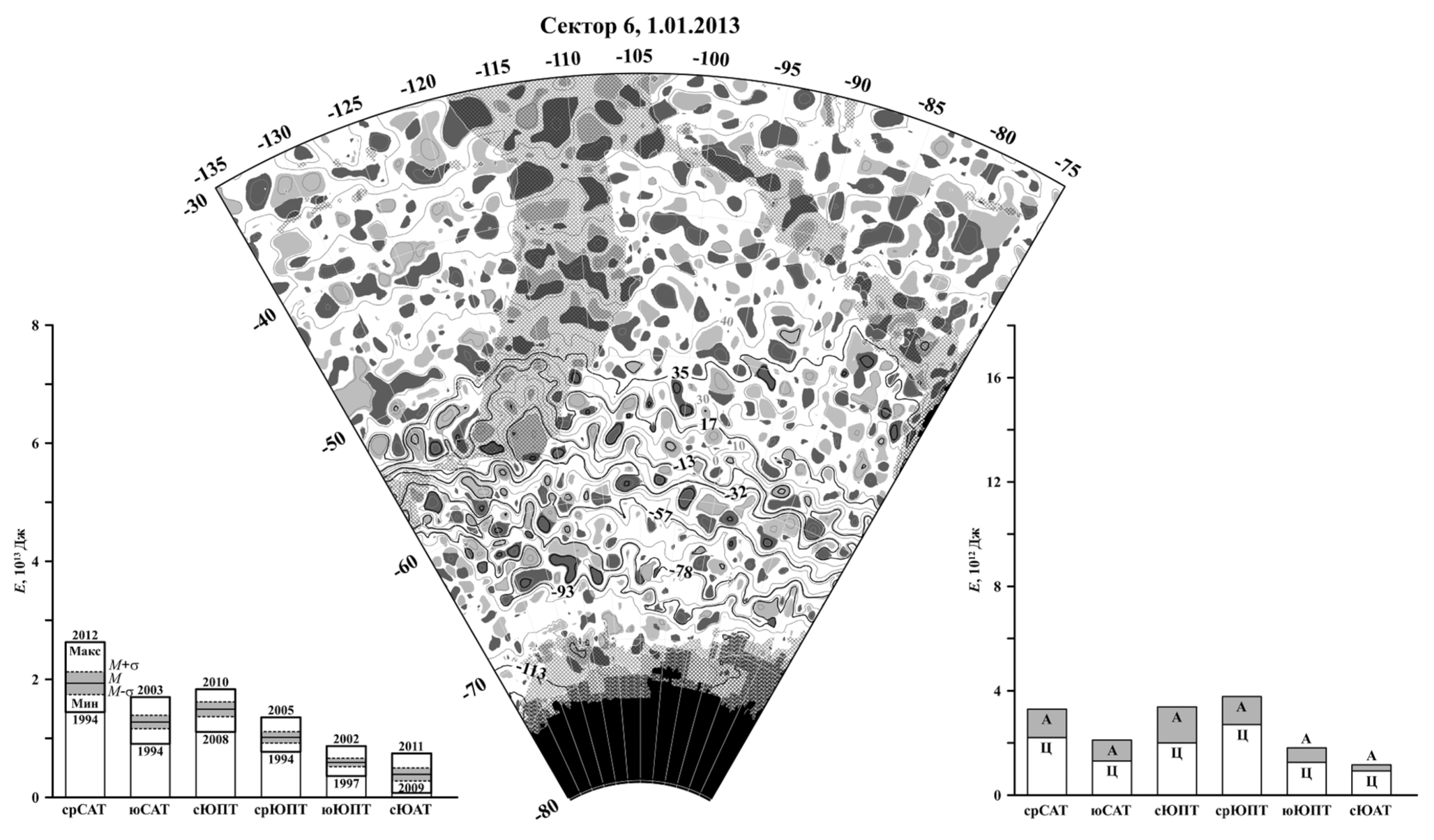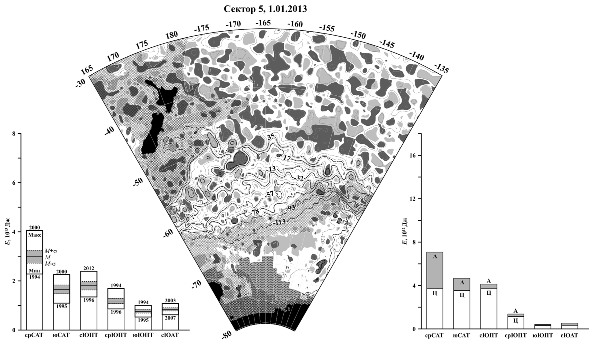 В отличие от всех остальных секторов антарктического кольца, в секторе 2 циклонические вихри в диапазоне АДТПО, характерном для АЦТ, формируются также за счет отрыва меандров Агульясского и продолжающего его Бенгельского течений, которые направлены соответственно на запад и северо-запад вдоль континентального склона Африки (напр., [4, 6]). Для учета этого обстоятельства при расчете средних энергий вихрей различных струй АЦТ в этом секторе (рис. 3, справа внизу) зона проникновения вихрей АЦТ была ограничена изогипсой 35 см, разграничивающей циркуляционные системы Агульясского течения–Агульясского противотечения и АЦТ (рис. 1).