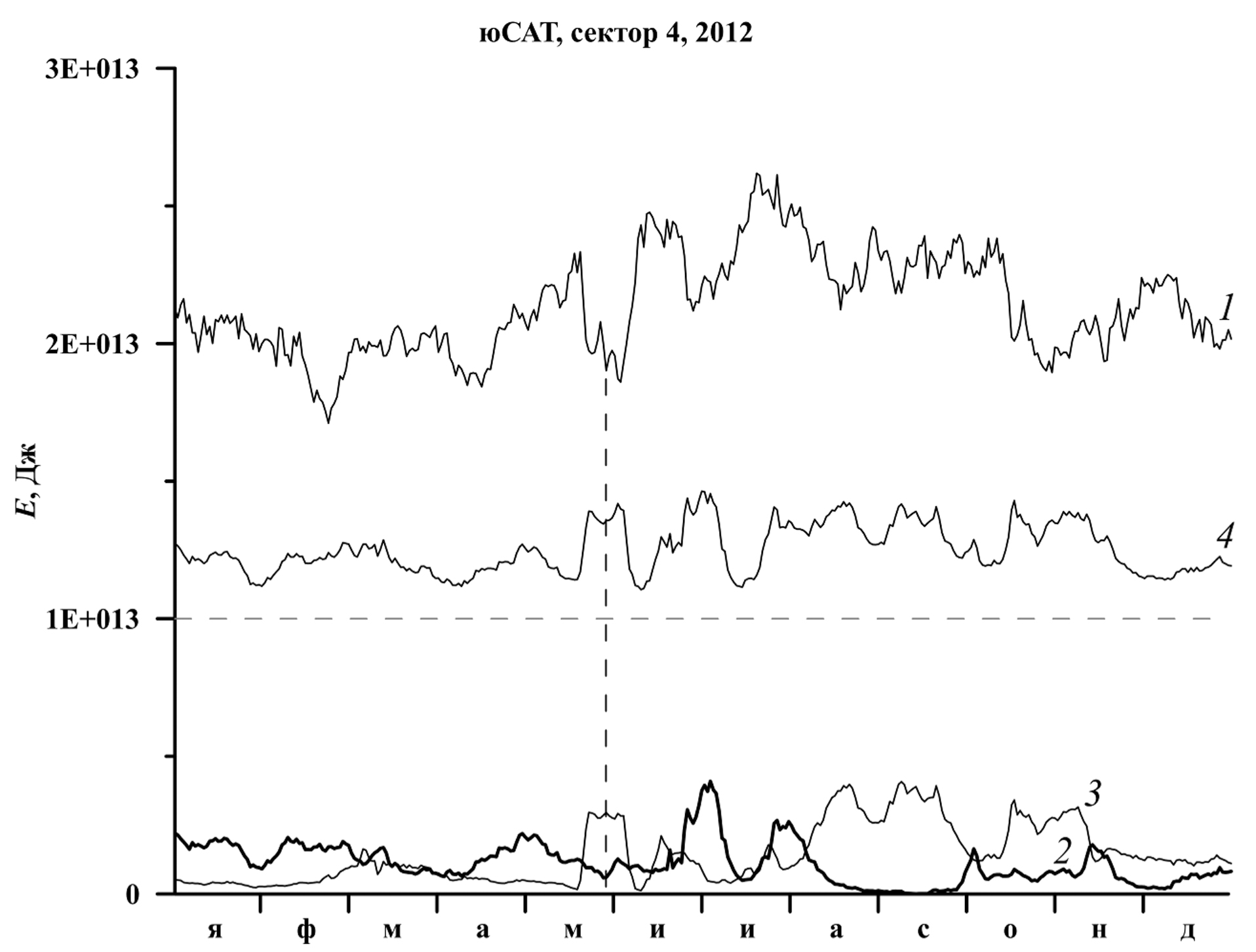 Рис. 8. Годовой ход кинетической энергии южной струи Субантарктического течения (кривая 1) и ее частей, вовлеченных в циклонические (кривая 2) и антициклонические (кривая 3) вихри в приповерхностном слое сектора 4 в 2012 г. Кривая 4, представляющая собой сумму кривых 2 и 3, для наглядности сдвинута вверх вдоль оси Е на величину 1013 Дж. Вертикальная штриховая прямая отмечает совпадения по времени локальных минимума кривой 1 и максимума кривой 3.