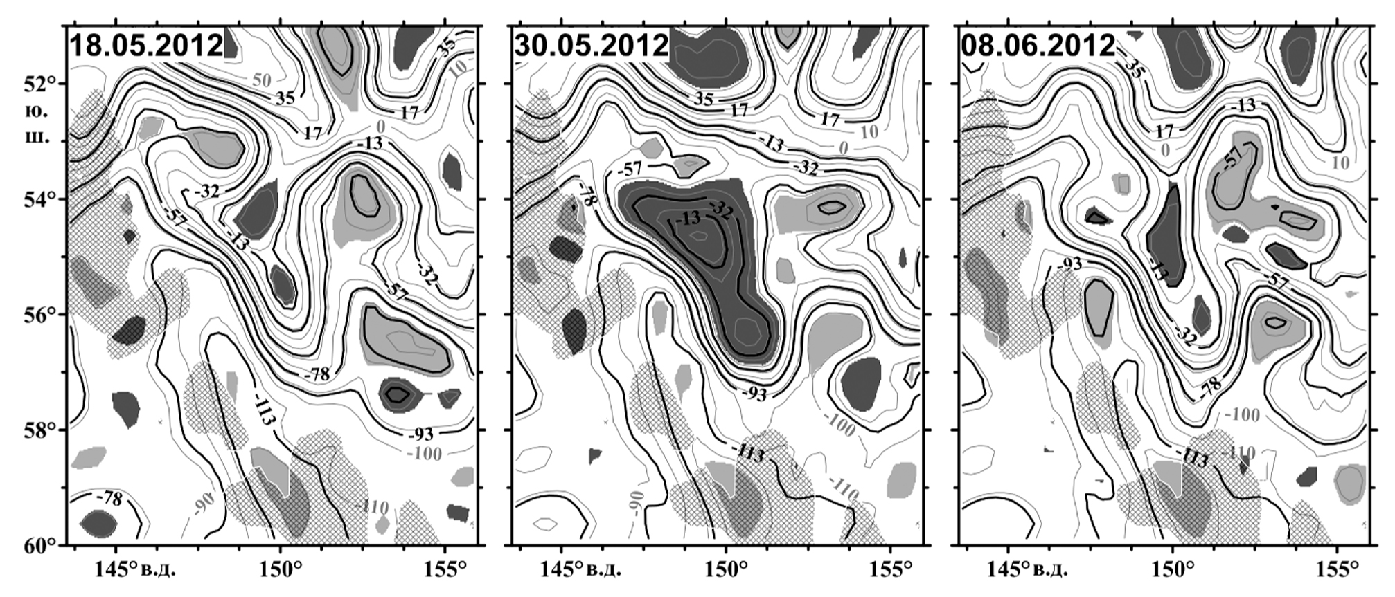Рис. 9. Карты АДТПО, демонстрирующие жизненный цикл антициклонического вихря срСАТ, юСАТ и сЮПТ в восточной части сектора 4 в мае–июне 2012 г. (ср. с рис. 8). Циклонические и антициклонические вихри показаны соответственно светлой и темной тушевкой. Остальное см. на рис. 1.