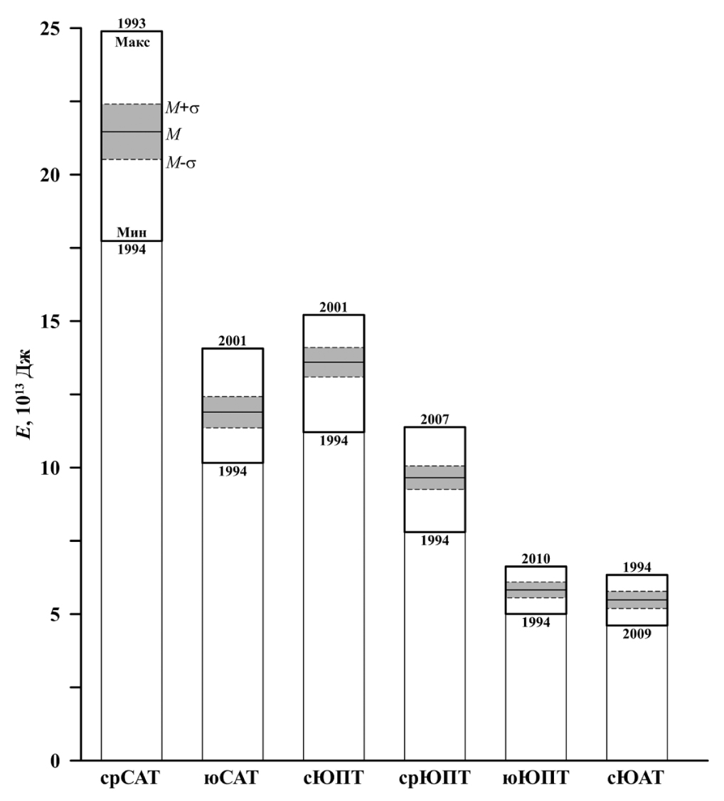 Рис. 10. Средние (M) за 1993–2015 гг., а также минимальные и максимальные среднесуточные значения кинетической энергии шести струй АЦТ в приповерхностном слое океана для антарктического кольца в целом. Даны годы достижения минимальных и максимальных среднесуточных значений; штриховыми линиями (M±σ) показаны средние значения со средними квадратическими отклонениями (σ) для разных струй.
