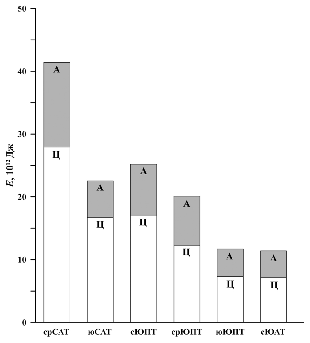 Переходя к энергии вихрей (внизу справа на рис. 2–7, 11), вспомним, что основным источником этой энергии является доступная потенциальная энергия (ДПЭ) струй, пропорциональная квадрату перепада плотности воды поперек струи [1]. Вследствие геострофичности и бароклинности океанских струй, включая струи АЦТ, рост их ДПЭ должен сопровождаться ростом их кинетической энергии (КЭ), в том числе и в верхнем слое океана; в то же время при росте ДПЭ струй должен усиливаться процесс генерации вихрей, а значит, должна расти КЭ вихрей. Таким образом, следует ожидать роста КЭ вихрей при росте КЭ струй, что полностью подтверждается сравнением рисунков 10 и 11, дающих одинаковое распределение струй АЦТ по порядку убывания как их собственной энергии, так и суммарной (Ц + А) энергии порождаемых ими вихрей: срСАТ — сЮПТ — юСАТ — срЮПТ — юЮПТ — сЮАТ. При этом суммарная по всем струям (и средняя по времени!) энергия собственно струй оказывается равной 6.85∙1014 Дж, а энергия порожденных ими вихрей — 1.38∙1014 Дж, то есть в 5 раз меньше (рис. 10, 11).