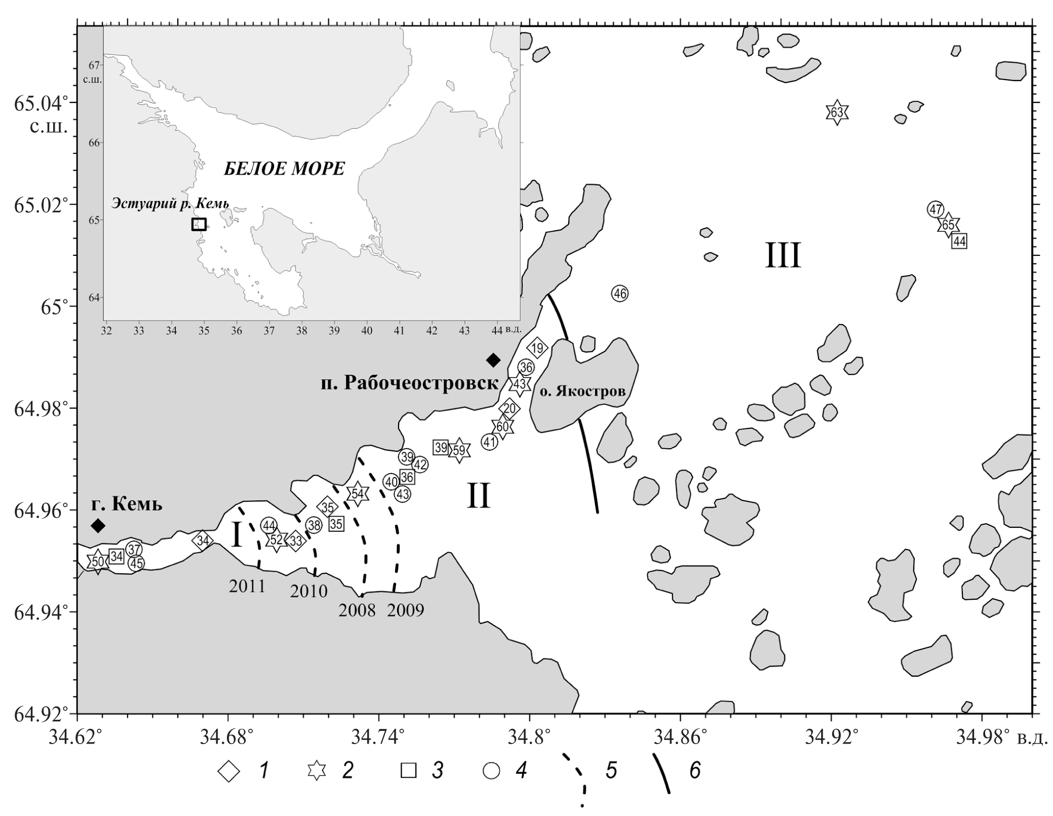 1 — станции, отобранные 25–27.06.2008 г., 2 — станции, отобранные 15–16.07.2009 г., 3 — станции, отобранные 24.07.2010 г., 4 — станции, отобранные 15–16.07.2011 г., 5 — граница между градиентной и речной зонами в разные годы, 6 — граница между градиентной и морской зонами.
